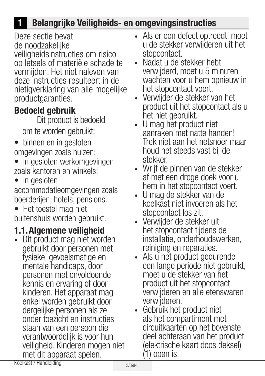 1 Belangrijke Veiligheids- en omgevingsinstructies • Als er een defect optreedt, moet Deze sectie bevat u de stekker verwijderen uit het de noodzakelijke stopcontact. veiligheidsinstructies om risico • Nadat u de stekker hebt op letsels of materiële schade te verwijderd, moet u 5 minuten vermijden. Het niet naleven van wachten voor u hem opnieuw in deze instructies resulteert in de het stopcontact voert. nietigverklaring van alle mogelijke • Verwijder de stekker van het productgaranties. product uit het stopcontact als u Bedoeld gebruik het niet gebruikt. Dit product is bedoeld • U mag het product niet om te worden gebruikt: aanraken met natte handen! Trek niet aan het netsnoer maar • binnen en in gesloten houd het steeds vast bij de omgevingen zoals huizen; stekker. • in gesloten werkomgevingen • Wrijf de pinnen van de stekker zoals kantoren en winkels; af met een droge doek voor u • in gesloten hem in het stopcontact voert. accommodatieomgevingen zoals • U mag de stekker van de boerderijen, hotels, pensions. koelkast niet invoeren als het • Het toestel mag niet stopcontact los zit. buitenshuis worden gebruikt. • Verwijder de stekker uit het stopcontact tijdens de 1.1. Algemene veiligheid installatie, onderhoudswerken, • Dit product mag niet worden reiniging en reparaties. gebruikt door personen met • Als u het product gedurende fysieke, gevoelsmatige en een lange periode niet gebruikt, mentale handicaps, door moet u de stekker van het personen met onvoldoende product uit het stopcontact kennis en ervaring of door verwijderen en alle etenswaren kinderen. Het apparaat mag verwijderen. enkel worden gebruikt door • Gebruik het product niet dergelijke personen als ze als het compartiment met onder toezicht en instructies circuitkaarten op het bovenste staan van een persoon die deel achteraan van het product verantwoordelijk is voor hun (elektrische kaart doos deksel) veiligheid. Kinderen mogen niet (1) open is. met dit apparaat spelen. Koelkast / Handleiding