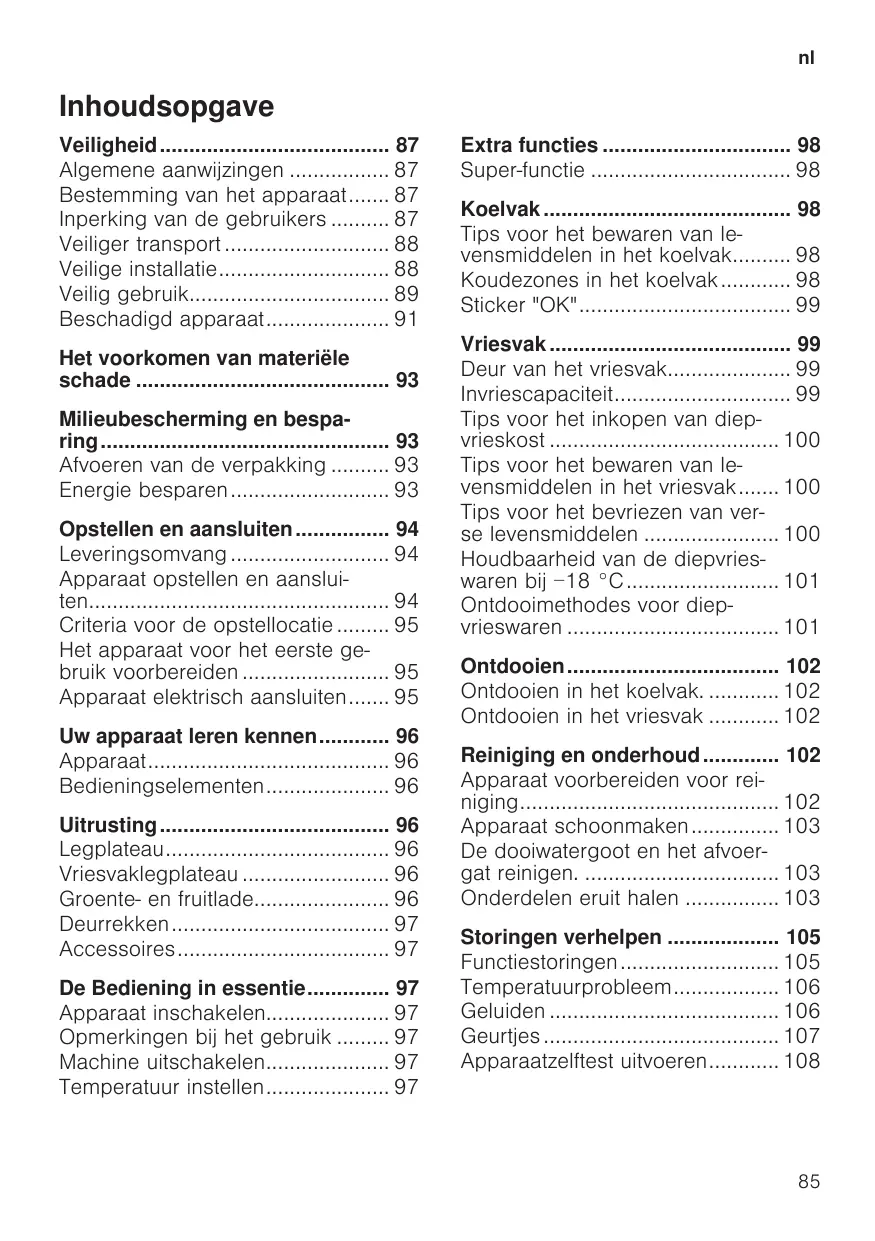 • Tips voor het bewaren van levensmiddelen in het vriesvak p. 100