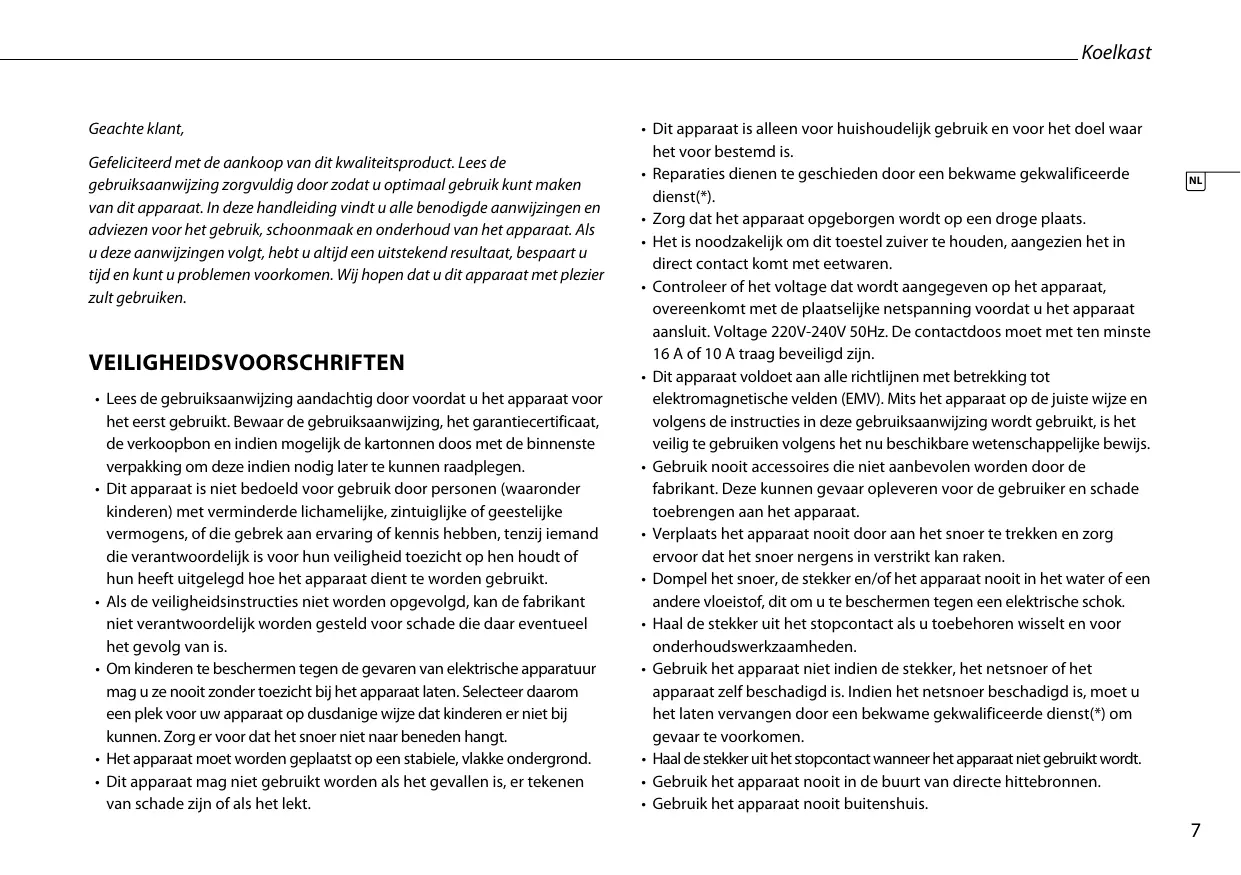 • Plaats het apparaat op een vlakke stabiele ondergrond in een goed geventileerde ruimte en houdt minimaal 10 cm. vrije ruimte rondom het apparaat. • Zorg ervoor dat het apparaat goed recht wordt geplaatst. Met de verstelbare voet (nr. 3) kan het apparaat waterpas worden gesteld. • Laat het apparaat, na transport, eerst minimaal 4 uur staan alvorens de stekker in het stopcontact wordt geplaatst. Voorkom dat het apparaat nat wordt. • Zorg dat de stroomkabel met de stekker niet wordt opgerold aan de achterkant van het apparaat, deze kan te warm worden. Paats de stekker altijd in een geaard stopcontact. • Plaats het apparaat nooit naast warmte bronnen of in direct zonlicht. Bewaar geen gevaarlijke stoffen in, op of rondom het apparaat.