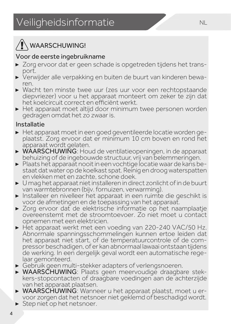 ▶ Il faut toujours au moins deux personnes pour la manipulation de l’appareil car il est lourd. Installation ▶ Placez l'appareil dans un endroit bien ventilé. Laissez un espace d'au moins 10 cm au-dessus et autour de l'appareil. ▶ AVERTISSEMENT : Les ouvertures d’aération du boîtier de l’appareil ou du modèle encastrable doivent être libres de toute obstruction. ▶ Ne placez jamais l'appareil dans une zone ou à un endroit humide où il pourrait être éclaboussé par de l'eau. Nettoyez et séchez les éclaboussures d'eau et les tâches à l'aide d'un chiffon doux et propre. ▶ N'installez pas l'appareil en direction des rayons solaires ou à proximité des sources de chaleur (par exemple, les cuisinières, chauffe-eau). ▶ Installez et positionnez l'appareil dans un espace adéquat tenant compte de sa taille et son utilisation. ▶ Vérifiez que les informations électriques sur la plaque signalétique sont conformes à l'alimentation électrique. Si ce n'est pas le cas, veuillez contacter un électricien. ▶ L’appareil fonctionne avec une alimentation de 220~240 VCA/50 Hz. Des fluctuations anormales de tension peuvent entraîner un échec de démarrage ou endommager le régulateur de température ou le compresseur, ou l'appareil peut émettre un bruit anormal pendant le fonctionnement. Dans de tels cas, installez un régulateur automatique. ▶ N’utilisez pas des adaptateurs multiprises et des rallonges. ▶ AVERTISSEMENT : N’installez pas plusieurs prises d’alimentation portatives ou blocs d’alimentation portatifs à l’arrière de l’appareil. ▶ AVERTISSEMENT : Lors du positionnement de l’appareil, assurez-vous que le cordon d’alimentation n’est pas coincé ou endommagé. ▶ Évitez de marcher sur le câble d'alimentation. 4