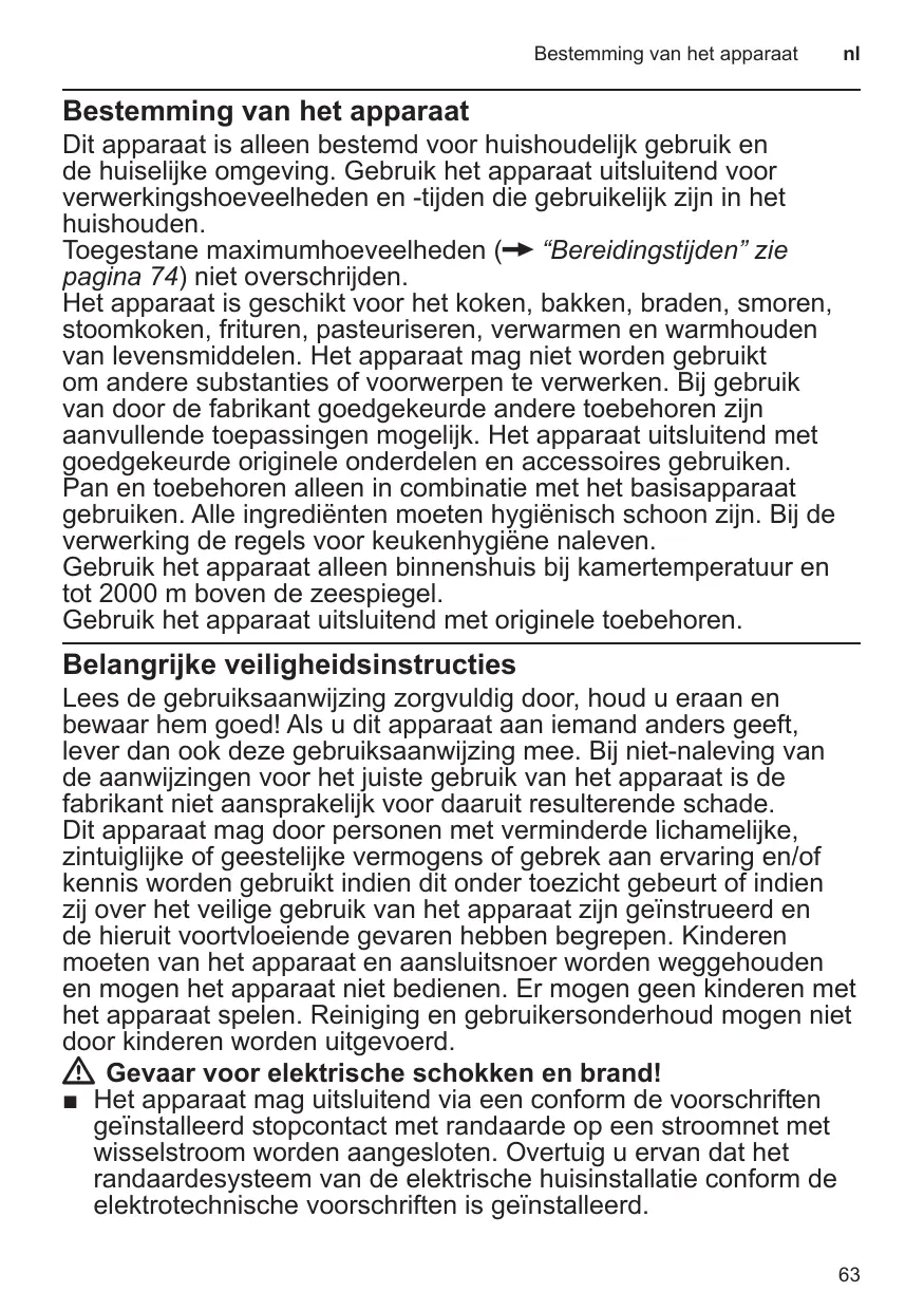 Dit apparaat is alleen bestemd voor huishoudelijk gebruik en de huiselijke omgeving. Gebruik het apparaat uitsluitend voor verwerkingshoeveelheden en -tijden die gebruikelijk zijn in het huishouden. Toegestane maximumhoeveelheden (X “Bereidingstijden” zie pagina 74) niet overschrijden. Het apparaat is geschikt voor het koken, bakken, braden, smoren, stoomkoken, frituren, pasteuriseren, verwarmen en warmhouden van levensmiddelen. Het apparaat mag niet worden gebruikt om andere substanties of voorwerpen te verwerken. Bij gebruik van door de fabrikant goedgekeurde andere toebehoren zijn aanvullende toepassingen mogelijk. Het apparaat uitsluitend met goedgekeurde originele onderdelen en accessoires gebruiken. Pan en toebehoren alleen in combinatie met het basisapparaat gebruiken. Alle ingrediënten moeten hygiënisch schoon zijn. Bij de verwerking de regels voor keukenhygiëne naleven. Gebruik het apparaat alleen binnenshuis bij kamertemperatuur en tot 2000 m boven de zeespiegel. Gebruik het apparaat uitsluitend met originele toebehoren.
