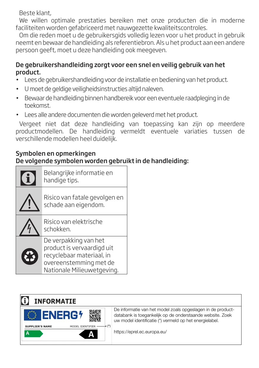 INFORMATIE SUPPLIER’S NAME A A MODEL IDENTIFIER A C De informatie van het model zoals opgeslagen in de productdatabank is toegankelijk op de onderstaande website. Zoek uw model identificatie (*) vermeld op het energielabel. (*)