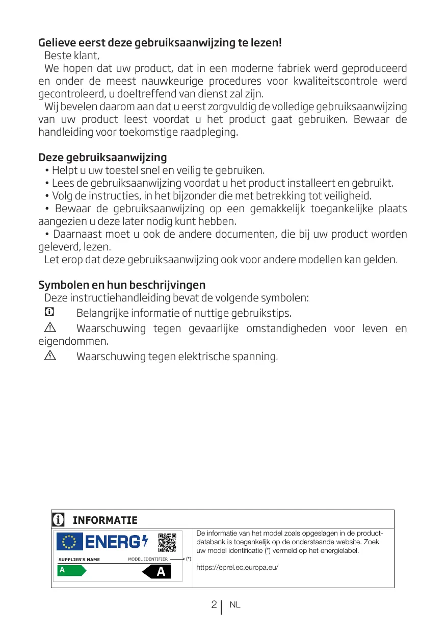 La disponibilité des pièces de rechange du réfrigérateur que vous avez acheté est de 10 ans. P endant cette période, des pièces de rechange originales seront disponibles pour faire fonctionner correctement le réfrigérateur. La durée minimale de garantie du réfrigérateur que vous avez acheté est de 24 mois. Cet appareil est doté d’une source d’éclairage de classe énergétique “G”. Seuls des réparateurs qualifiés sont autorisés à procéder au remplacement de la source d’éclairage de cet appareil.