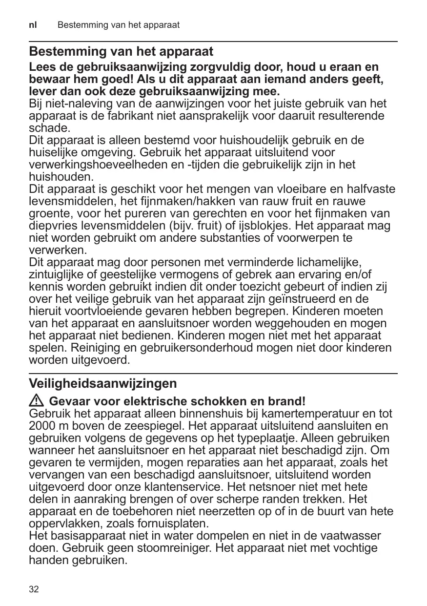 Cet appareil est destiné exclusivement à une utilisation domestique et non professionnelle. Utiliser cet appareil uniquement pour des quantités de préparations culinaires courantes et pour des durées de service normales. Cet appareil convient pour mélanger les produits alimentaires liquides et mi-durs, à broyer / hacher les fruits et légumes crus, à réduire les préparations en purée et pour broyer les produits alimentaires surgelés (les fruits par exemple) ou les glaçons. L’appareil ne doit pas servir à transformer d’autres substances ou objets. Cet appareil peut être utilisé par des personnes aux capacités physiques, sensorielles ou mentales réduites ou des personnes inexpérimentées, à condition qu’elles soient surveillées ou qu’elles aient été informées de l’utilisation sûre de l’appareil et qu’elles comprennent les risques inhérents à son usage. Il faut tenir les enfants à l’écart de l’appareil et du cordon de branchement et ne pas leur permettre d’utiliser l’appareil. Ne pas laisser les enfants jouer avec l’appareil. Le nettoyage et l’entretien incombant à l’utilisateur ne doivent pas être effectués par des enfants.