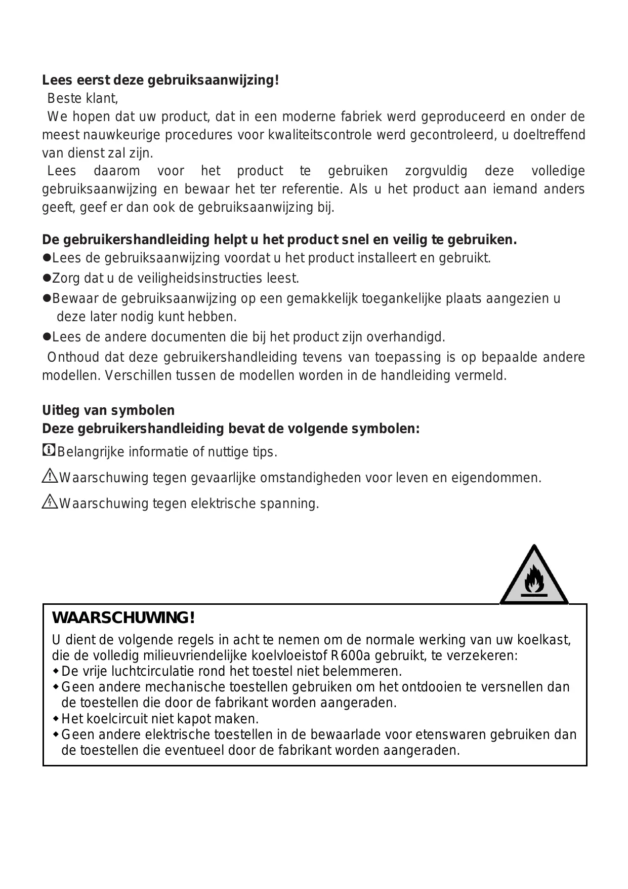 Please review this list before calling the service. It will save your time and money. This list includes frequent complaints that are not arising from defective workmanship or material usage. Some of the features described here may not exist in your product. The refrigerator does not operate. Veuillez donc lire attentivement l'intégralité de ce manuel avant de commencer à utiliser le produit et conservez-le manuel comme référence. Si vous remettez cet appareil à quelqu'un d'autre, remettez-lui également le manuel d'utilisation. Le présent manuel vous aidera à utiliser votre produit en toute sécurité et efficacement. • Veuillez lire le manuel avant l'installation et l'utilisation du produit. • Veuillez lire les instructions de sécurité. • Conservez ce manuel dans un endroit facilement accessible car vous pourriez en avoir besoin ultérieurement. • Lisez également la documentation fournie avec le produit. N'oubliez pas que le présent manuel d'utilisation est également valable pour plusieurs autres modèles. Les différences entre les différents modèles seront identifiées dans le manuel. Explication des symboles Les symboles ci-après sont utilisés dans le manuel d'utilisation : Informations importantes ou astuces. Avertissement relatif aux conditions dangereuses pour la vie et la propriété. Avertissement relatif à la tension électrique.