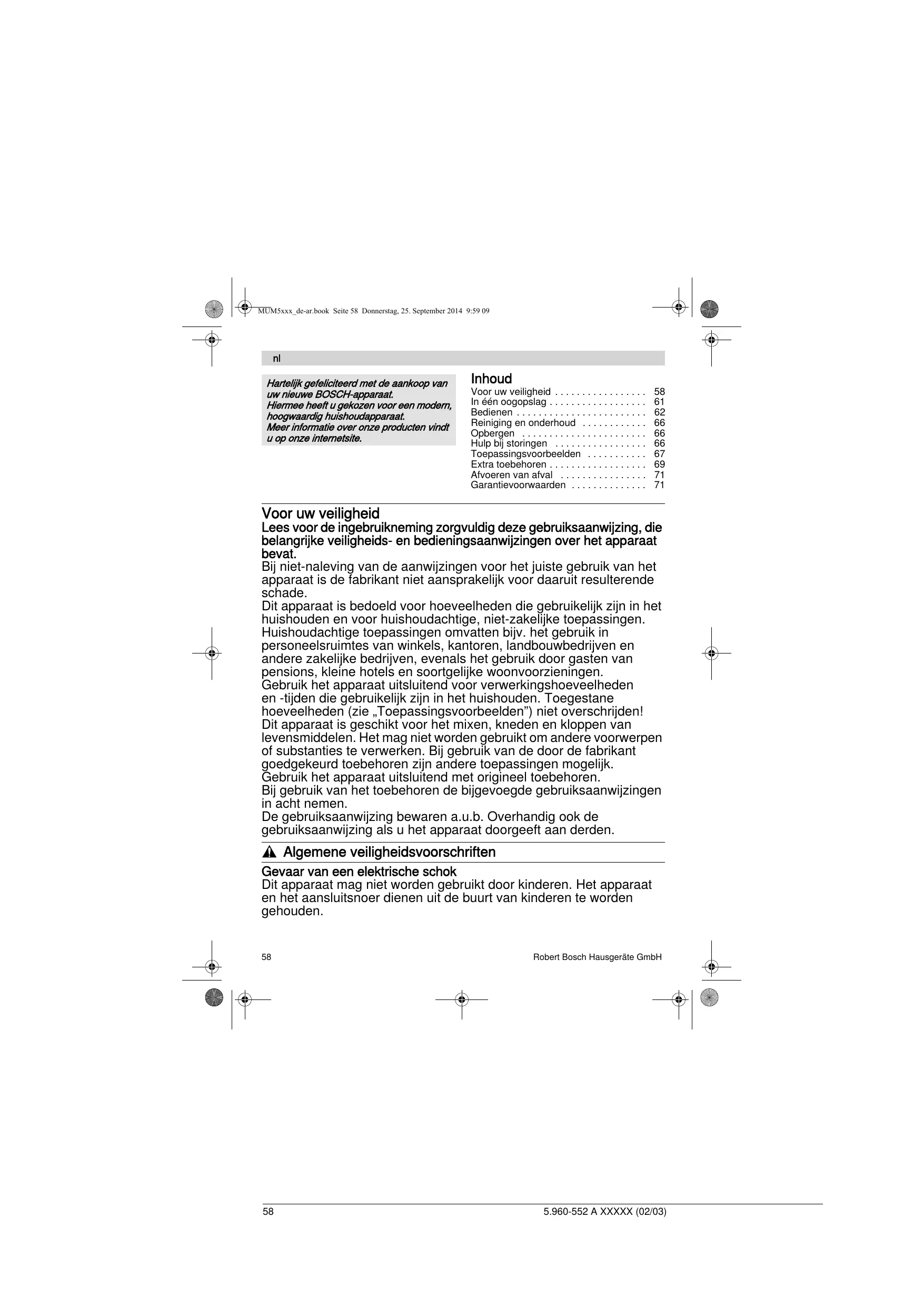 bezüglich des sicheren Gebrauchs des Gerätes unterwiesen wurden und die daraus resultierenden Gefahren verstanden haben. Kinder dürfen nicht mit dem Gerät spielen. Gerät nicht ohne Aufsicht betreiben. Gerät nur gemäß Angaben auf dem Typenschild anschließen und betreiben. Nur zur Verwendung in geschlossenen Räumen. Durchlaufschnitzler nur bei Stillstand des Antriebes und bei gezogenem Netzstecker aufsetzen/abnehmen. Nicht in den Einfüllschacht greifen. Während des Betriebes nie in die Schüssel greifen. Nur mit aufgesetztem Deckel (12) arbeiten! Um bei einer Überlastung des Durchlaufschnitzlers größere Schäden an Congratulations on the purchase of your new BOSCH appliance. In doing so, you have opted for a modern, high-quality domestic appliance. You can find further information about our products on our web page. Connect and operate the appliance only in accordance with the specifications on the rating plate. Only use indoors. Do not use the appliance if the power cord and/or appliance are damaged. Before replacing accessories or additional parts, which move during operation, switch off the appliance and disconnect from the power supply. Always disconnect the appliance from the supply if it is left unattended and before assembling, disassembling or cleaning. Do not place the power cord over sharp edges or hot surfaces. This appliance is identified according to the European guideline 2012/19/EU on waste electrical and electronic equipment – WEEE. Vous venez ainsi d’opter pour un appareil électroménager moderne et de haute qualité. Sur notre site Web, vous trouverez des informations avancées sur nos produits.