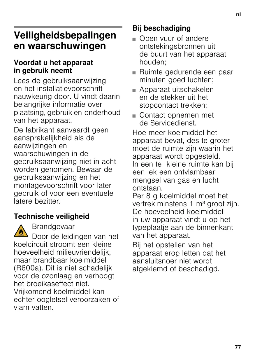 Veiligheidsbepalingen en waarschuwingen Voordat u het apparaat in gebruik neemt Lees de gebruiksaanwijzing en het installatievoorschrift nauwkeurig door. U vindt daarin belangrijke informatie over plaatsing, gebruik en onderhoud van het apparaat. De fabrikant aanvaardt geen aansprakelijkheid als de aanwijzingen en waarschuwingen in de gebruiksaanwijzing niet in acht worden genomen. Bewaar de gebruiksaanwijzing en het montagevoorschrift voor later gebruik of voor een eventuele latere bezitter. Technische veiligheid Brandgevaar Door de leidingen van het koelcircuit stroomt een kleine hoeveelheid milieuvriendelijk, maar brandbaar koelmiddel (R600a). Dit is niet schadelijk voor de ozonlaag en verhoogt het broeikaseffect niet. Vrijkomend koelmiddel kan echter oogletsel veroorzaken of vlam vatten.