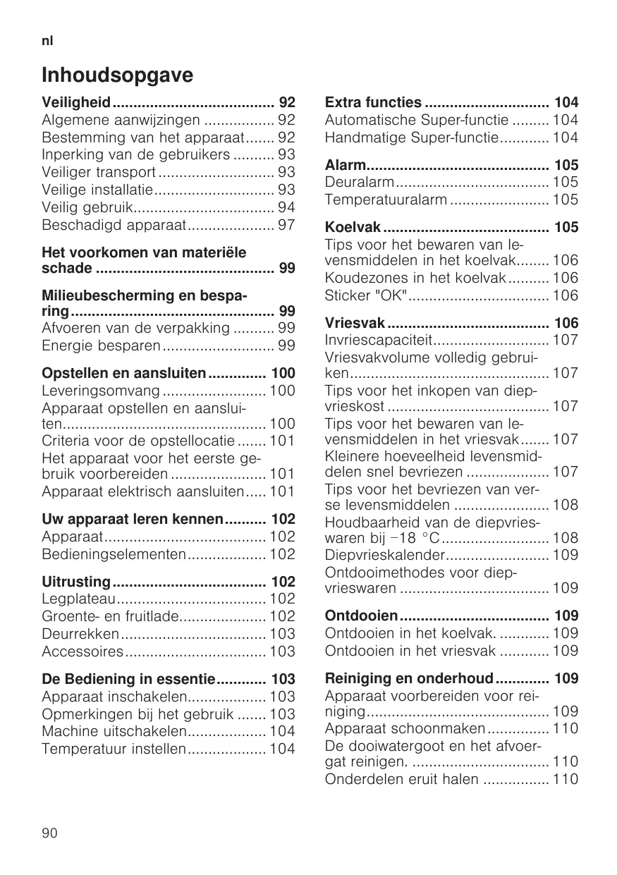 Tips voor het inkopen van diep- vrieskost . Tips voor het bewaren van le- vensmiddelen in het vriesvak. Kleinere hoeveelheid levensmid- delen snel bevriezen Tips voor het bevriezen van ver- se levensmiddelen .. Houdbaarheid van de diepvries- waren bij -18 °C Diepvrieskalende: