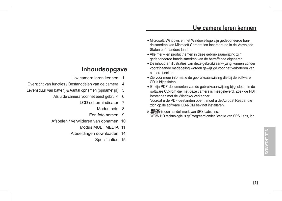 NEDERLANDS Uw camera leren kennen Overzicht van functies / Bestanddelen van de camera Levensduur van batterij & Aantal opnamen (opnametijd) Als u de camera voor het eerst gebruikt LCD schermindicator Modustoets Een foto nemen Afspelen / verwijderen van opnamen Modus MULTIMEDIA Afbeeldingen downloaden Specificaties å Microsoft, Windows en het Windows-logo zijn gedeponeerde handelsmerken van Microsoft Corporation Incorporated in de Verenigde Staten en/of andere landen. å Alle merk- en productnamen in deze gebruiksaanwijzing zijn gedeponeerde handelsmerken van de betreffende eigenaren. å De inhoud en illustraties van deze gebruiksaanwijzing kunnen zonder voorafgaande mededeling worden gewijzigd voor het verbeteren van camerafuncties. å Zie voor meer informatie de gebruiksaanwijzing die bij de software CD is bijgesloten. å Er zijn PDF-documenten van de gebruiksaanwijzing bijgesloten in de software CD-rom die met deze camera is meegeleverd. Zoek de PDF bestanden met de Windows Verkenner. Voordat u de PDF-bestanden opent, moet u de Acrobat Reader die zich op de software CD-ROM bevindt installeren.
