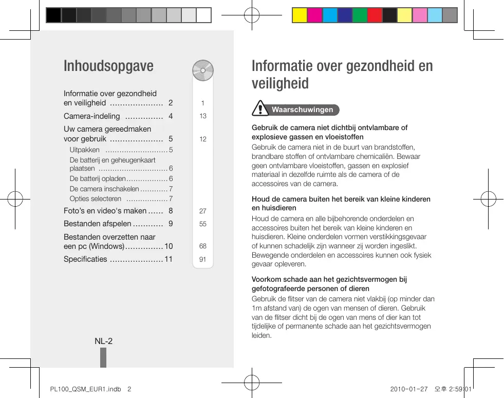 NL-2 PL100_QSM_EUR1.indb 2 Waarschuwingen Gebruik de camera niet dichtbij ontvlambare of explosieve gassen en vloeistoffen Gebruik de camera niet in de buurt van brandstoffen, brandbare stoffen of ontvlambare chemicaliën. Bewaar geen ontvlambare vloeistoffen, gassen en explosief materiaal in dezelfde ruimte als de camera of de accessoires van de camera. Houd de camera buiten het bereik van kleine kinderen en huisdieren Houd de camera en alle bijbehorende onderdelen en accessoires buiten het bereik van kleine kinderen en huisdieren. Kleine onderdelen vormen verstikkingsgevaar of kunnen schadelijk zijn wanneer zij worden ingeslikt. Bewegende onderdelen en accessoires kunnen ook fysiek gevaar opleveren. Voorkom schade aan het gezichtsvermogen bij gefotografeerde personen of dieren Gebruik de flitser van de camera niet vlakbij (op minder dan 1m afstand van) de ogen van mensen of dieren. Gebruik van de flitser dicht bij de ogen van mens of dier kan tot tijdelijke of permanente schade aan het gezichtsvermogen leiden. 2010-01-27 오후 2:59:01 Behandel batterijen en oplader voorzichtig en voer deze af volgens de voorschriften