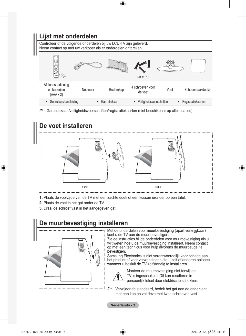 - Registratiekaarten Garantiekaart/veiligheidsvoorschriften/registratiekaarten (niet beschikbaar op alle locaties) De voet installeren <2> <3> . Plaats de voorzijde van de TV met een zachte doek of een kussen eronder op een tafel. . Plaats de voet in het gat onder de TV. . Draai de schroef vast in het aangegeven gat. De muurbevestiging installeren Met de onderdelen voor muurbevestiging (apart verkrijgbaar) kunt u de TV aan de muur bevestigen. Zie de instructies bij de onderdelen voor muurbevestiging als u wilt weten hoe u de muurbevestiging installeert. Neem contact op met een technicus voor hulp alvorens de muurbeugel te bevestigen. Samsung Electronics is niet verantwoordelijk voor schade aan het product of voor verwondingen die u zelf of anderen oplopen wanneer u besluit de TV zelfstandig te installeren. Monteer de muurbevestiging niet terwijl de TV is ingeschakeld. Dit kan resulteren in persoonlijk letsel door elektrische schokken.