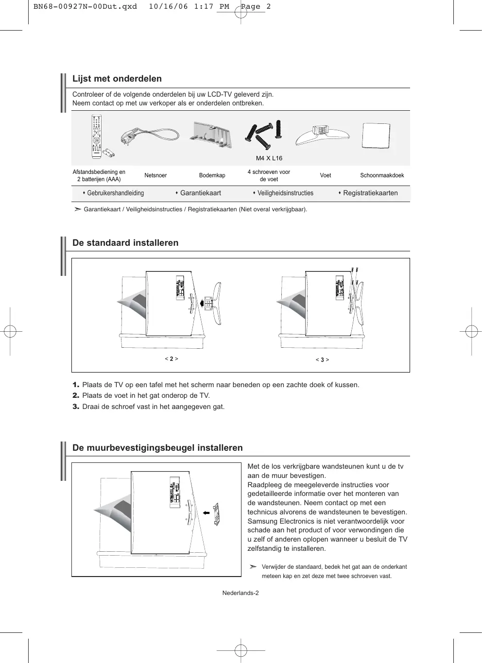 - Beeld stilzetten BN68-00927N-00Dut.qxd 10/16/06 1:17 PM Page 2 Lijst met onderdelen Controleer of de volgende onderdelen bij uw LCD-TV geleverd zijn. Neem contact op met uw verkoper als er onderdelen ontbreken. M4 X L16 Afstandsbediening en 2 batterijen (AAA) Gebruikershandleiding Netsnoer Bodemkap Garantiekaart 4 schroeven voor de voet Voet Veiligheidsinstructies Schoonmaakdoek Registratiekaarten Garantiekaart / Veiligheidsinstructies / Registratiekaarten (Niet overal verkrijgbaar). De standaard installeren <2> <3> p. 12