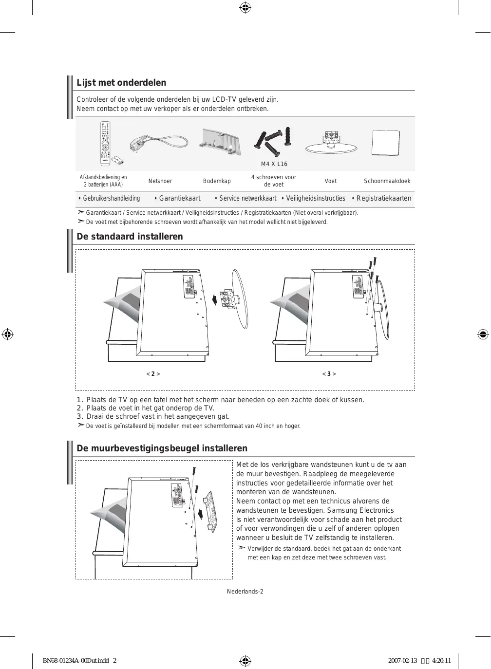 - Technische specificaties en milieu Opmerking Knop Eenmaal drukken Nederlands- BN68-01234A-00Dut.indd 1 2007-02-13 4:20:09 Lijst met onderdelen Controleer of de volgende onderdelen bij uw LCD-TV geleverd zijn. Neem contact op met uw verkoper als er onderdelen ontbreken. M4 X L16 Afstandsbediening en 2 batterijen (AAA) Netsnoer Gebruikershandleiding Garantiekaart 4 schroeven voor de voet Bodemkap Voet Schoonmaakdoek Service netwerkkaart Veiligheidsinstructies Registratiekaarten Garantiekaart / Service netwerkkaart / Veiligheidsinstructies / Registratiekaarten (Niet overal verkrijgbaar). De voet met bijbehorende schroeven wordt afhankelijk van het model wellicht niet bijgeleverd. De standaard installeren <2> <3> p. 26
