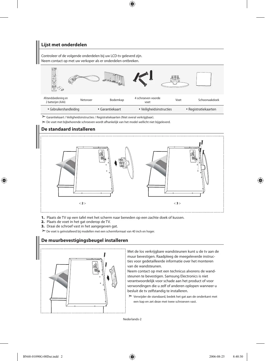 - De televisie automatisch aan uitschakelen Symbolen Druk op Belangrijk Opmerking Knop Eenmaal drukken Nederlands-1 BN68-01090G-00Dut.indd 1 2006-08-25 8:40:22 Lijst met onderdelen Controleer of de volgende onderdelen bij uw LCD-tv geleverd zijn. Neem contact op met uw verkoper als er onderdelen ontbreken. Afstandsbediening en 2 batterijen (AAA) Netsnoer Gebruikershandleiding 4 schroeven voorde voet Bodemkap Garantiekaart Voet Veiligheidsinstructies Schoonaakdoek Registratiekaarten Garantiekaart / Veiligheidsinstructies / Registratiekaarten (Niet overal verkrijgbaar). De voet met bijbehorende schroeven wordt afhankelijk van het model wellicht niet bijgeleverd. De standaard installeren <2> <3> p. 21