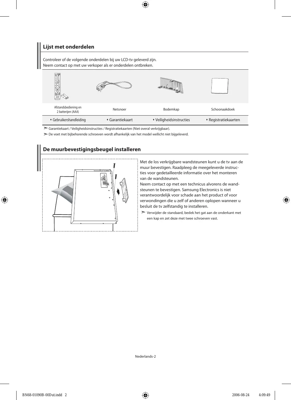 - De televisie automatisch aan uitschakelen Symbolen Druk op Belangrijk Opmerking Knop Eenmaal drukken Nederlands-1 BN68-01090B-00Dut.indd 1 2006-08-24 4:09:38 Lijst met onderdelen Controleer of de volgende onderdelen bij uw LCD-tv geleverd zijn. Neem contact op met uw verkoper als er onderdelen ontbreken. Afstandsbediening en 2 batterijen (AAA) Gebruikershandleiding Netsnoer Bodemkap Garantiekaart Veiligheidsinstructies Schoonaakdoek Registratiekaarten Garantiekaart / Veiligheidsinstructies / Registratiekaarten (Niet overal verkrijgbaar). De voet met bijbehorende schroeven wordt afhankelijk van het model wellicht niet bijgeleverd. De muurbevestigingsbeugel installeren Met de los verkrijgbare wandsteunen kunt u de tv aan de muur bevestigen. Raadpleeg de meegeleverde instructies voor gedetailleerde informatie over het monteren van de wandsteunen. Neem contact op met een technicus alvorens de wandsteunen te bevestigen. Samsung Electronics is niet verantwoordelijk voor schade aan het product of voor verwondingen die u zelf of anderen oplopen wanneer u besluit de tv zelfstandig te installeren. Verwijder de standaard, bedek het gat aan de onderkant met een kap en zet deze met twee schroeven vast. Nederlands-2 BN68-01090B-00Dut.indd 2 2006-08-24 4:09:49 Overzicht van het bedieningspaneel De kleur en vormgeving van het product kunnen afhankelijk van het model variëren. SOURCE Schakelen tussen alle beschikbare ingangsbronnen. (TV, Ext.1, Ext.2, AV, S-Video, Component, PC, HDMI1, HDMI2). Gebruik deze knop in het schermmenu zoals u de knop ENTER/OK gebruikt op de afstandsbediening. MENU Druk op de toets om op uw scherm het menu met de functies van uw televisie te bekijken. Hiermee kunt u het volume verlagen of verhogen. Gebruik de knoppen in het schermmenu zoals u de knoppen en gebruikt op de afstandsbediening. Druk op de afstandsbediening om van kanaal te veranin het scherderen. Gebruik de knoppen mmenu zoals u de knoppen en gebruikt op de afstandsbediening. (Zonder de afstandsbediening kunt u de tv inschakelen door de kanaaltoetsen in te drukken.) Luidsprekers (Stroom) Druk op de toets om de televisie aan en uit te zetten. Controlelampje stroom Knippert en gaat uit als de stroom ingeschakeld is en licht op bij de modus stand-by. Sensor voor de afstandsbediening Richt de afstandsbediening op dit punt op de tv. Nederlands-3 BN68-01090B-00Dut.indd 3 2006-08-24 4:09:50 Overzicht van het aansluitpaneel [Aansluitingen op chterpaneel] [Aansluitingen op zijpaneel] Netvoeding Wanneer u een extern apparaat aansluit op de tv moet het toestel zijn uitgeschakeld. Zorg bij het aansluiten van een externe aansluiting dat de kleuren van de aansluiting en de kabel overeenkomen. Nederlands-4 BN68-01090B-00Dut.indd 4 2006-08-24 4:09:51 Aansluiten op antenne of kabeltelevisienetwerk Voor de juiste weergave van tv-kanalen moet het toestel een signaal ontvangen via een van de volgende bronnen: - Een buitenantenne / Een kabeltelevisienetwerk / Een satellietnetwerk Het aansluiten van HDMI/DVI - Ondersteunt verbindingen met audiovisuele apparatuur die met HDMI verbonden kan worden (set top boxes, dvd-spelers, audiovisuele ontvangers en digitale tv’s). - Voor een HDMI - HDMI aansluiting is geen extra audio-aansluiting nodig. Wat is HDMI? - Met HDMI (‘High Definition Multimedia Interface’) kunnen hoge-definitie digitale videogegevens en meerdere kanalen met digitale audio (5.1 kanalen) worden uitgezonden. - De HDMI/DVI-uitgang ondersteunt een DVI-aansluiting op externe apparatuur met een geschikte kabel (niet meegele-verd). Het HDMI-apparaat is kleiner dan de DVI. Verder is bij HDMI de coderingsfunctie HDCP (‘High Bandwidth Digital Copy Protection’; digitale kopieerbeveiliging met grote bandbreedte) geïnstalleerd en wordt digitale audio van meer-dere kanalen ondersteund. Voor deze verbinding dient u gebruik te maken van een DVI-naar-HDMI-kabel of van een DVI-HDMI-aanbieder en de “R - AUDIO - L”-terminal op DVI te zetten voor geluidsweergave. - Wanneer u dit product via HDMI of DVI aansluit op bijvoorbeeld een Set Top Box, dvd-speler of spelcomputer, zorg er dan voor dat de video-uitgang compatibel ingesteld is zoals weergegeven in de onderstaande tabel. Als u dit niet doet kan het beeld storen, gebroken zijn of zelfs ontbreken. Ondersteunde modi voor DVI en HDMI 720p 576p 576i 480p 480i p. 21