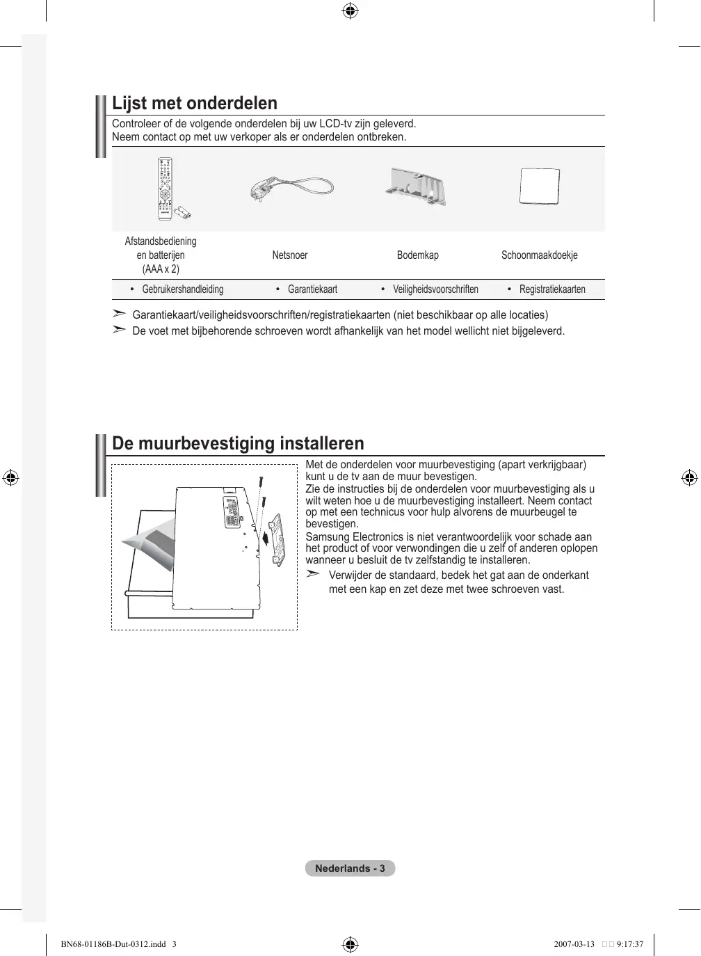 Diefstal voorkomen met het Kensington-slot..... 59 Problemen oplossen: voordat u de technische dienst inschakelt................................................ 59 Technische specificaties en milieu.................... 60 Symbolen Druk op Belangrijk Opmerking Knop Eenmaal drukken Nederlands - BN68-01186B-Dut-0312.indd 2 2007-03-13 9:33:23 Lijst met onderdelen Controleer of de volgende onderdelen bij uw LCD-tv zijn geleverd. Neem contact op met uw verkoper als er onderdelen ontbreken. Afstandsbediening en batterijen (AAA x 2)
