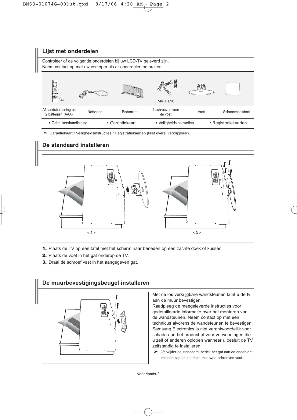 - Beeld stilzetten BN68-01074G-00Dut.qxd 8/17/06 4:28 AM Page 2 Lijst met onderdelen Controleer of de volgende onderdelen bij uw LCD-TV geleverd zijn. Neem contact op met uw verkoper als er onderdelen ontbreken. M4 X L16 Afstandsbediening en 2 batterijen (AAA) Netsnoer Gebruikershandleiding Bodemkap Garantiekaart 4 schroeven voor de voet Voet Veiligheidsinstructies Schoonmaakdoek Registratiekaarten Garantiekaart / Veiligheidsinstructies / Registratiekaarten (Niet overal verkrijgbaar). De standaard installeren <2> <3> p. 12