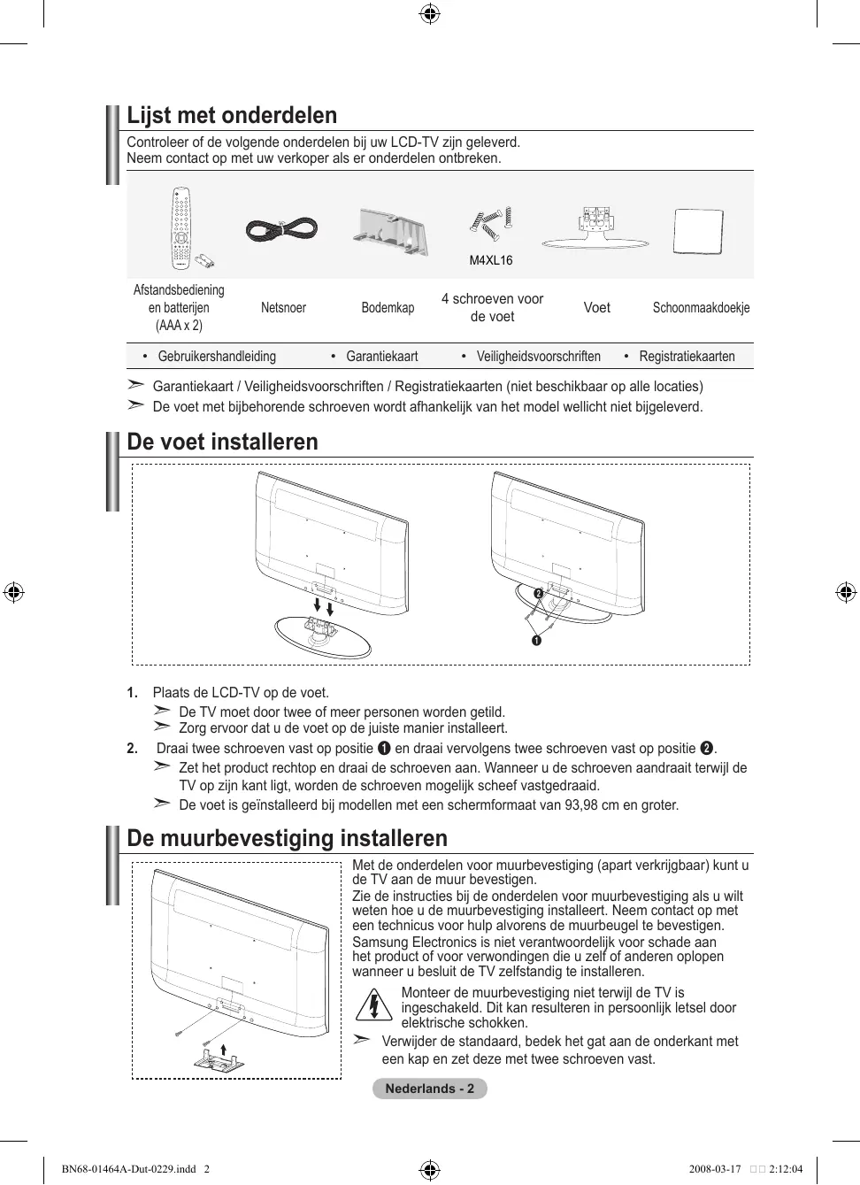 - Technische specificaties en milieu Nederlands - BN68-01464A-Dut-0229.indd 1 2008-03-17 2:12:03 Lijst met onderdelen Controleer of de volgende onderdelen bij uw LCD-TV zijn geleverd. Neem contact op met uw verkoper als er onderdelen ontbreken. M4XL16 Afstandsbediening en batterijen (AAA x 2) Netsnoer p. 57