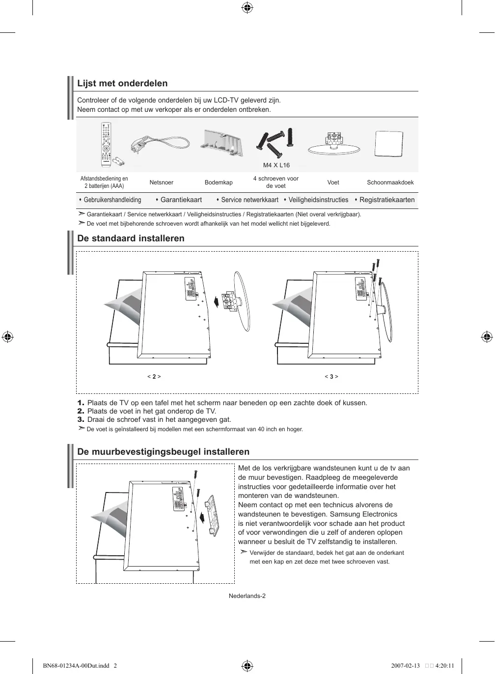 - Technische specificaties en milieu Opmerking Knop Eenmaal drukken Nederlands- BN68-01234A-00Dut.indd 1 2007-02-13 4:20:09 Lijst met onderdelen Controleer of de volgende onderdelen bij uw LCD-TV geleverd zijn. Neem contact op met uw verkoper als er onderdelen ontbreken. M4 X L16 Afstandsbediening en 2 batterijen (AAA) Netsnoer Gebruikershandleiding Garantiekaart 4 schroeven voor de voet Bodemkap Voet Schoonmaakdoek Service netwerkkaart Veiligheidsinstructies Registratiekaarten Garantiekaart / Service netwerkkaart / Veiligheidsinstructies / Registratiekaarten (Niet overal verkrijgbaar). De voet met bijbehorende schroeven wordt afhankelijk van het model wellicht niet bijgeleverd. De standaard installeren <2> <3> p. 26