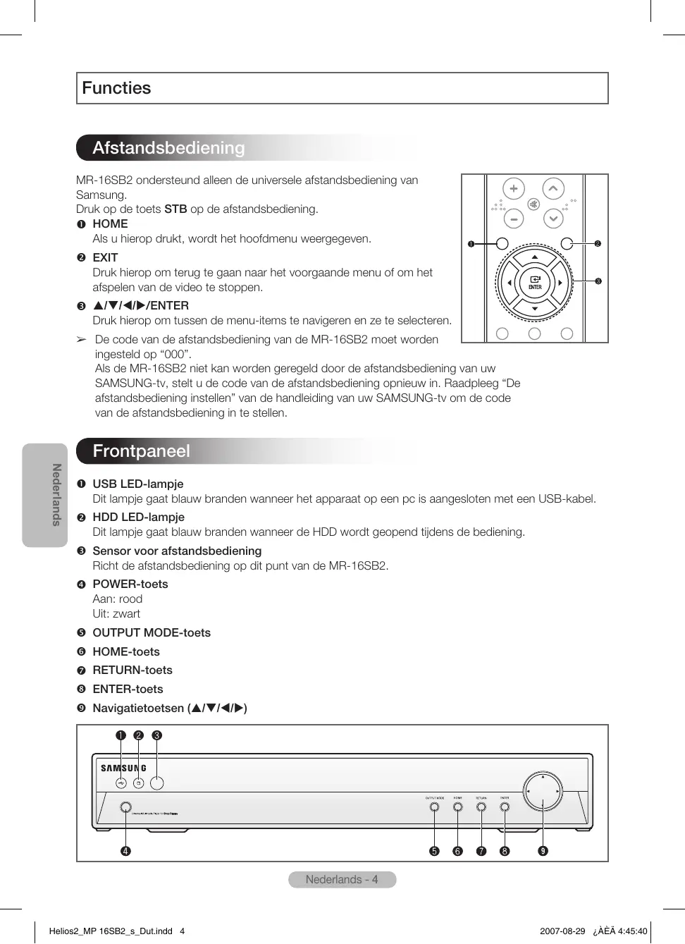 Functies Afstandsbediening MR-16SB2 ondersteund alleen de universele afstandsbediening van Samsung. Druk op de toets STB op de afstandsbediening. HOME Als u hierop drukt, wordt het hoofdmenu weergegeven. EXIT Druk hierop om terug te gaan naar het voorgaande menu of om het afspelen van de video te stoppen. ////ENTER Druk hierop om tussen de menu-items te navigeren en ze te selecteren. ➢ De code van de afstandsbediening van de MR-16SB2 moet worden ingesteld op “000”. Als de MR-16SB2 niet kan worden geregeld door de afstandsbediening van uw SAMSUNG-tv, stelt u de code van de afstandsbediening opnieuw in. Raadpleeg “De afstandsbediening instellen” van de handleiding van uw SAMSUNG-tv om de code van de afstandsbediening in te stellen.