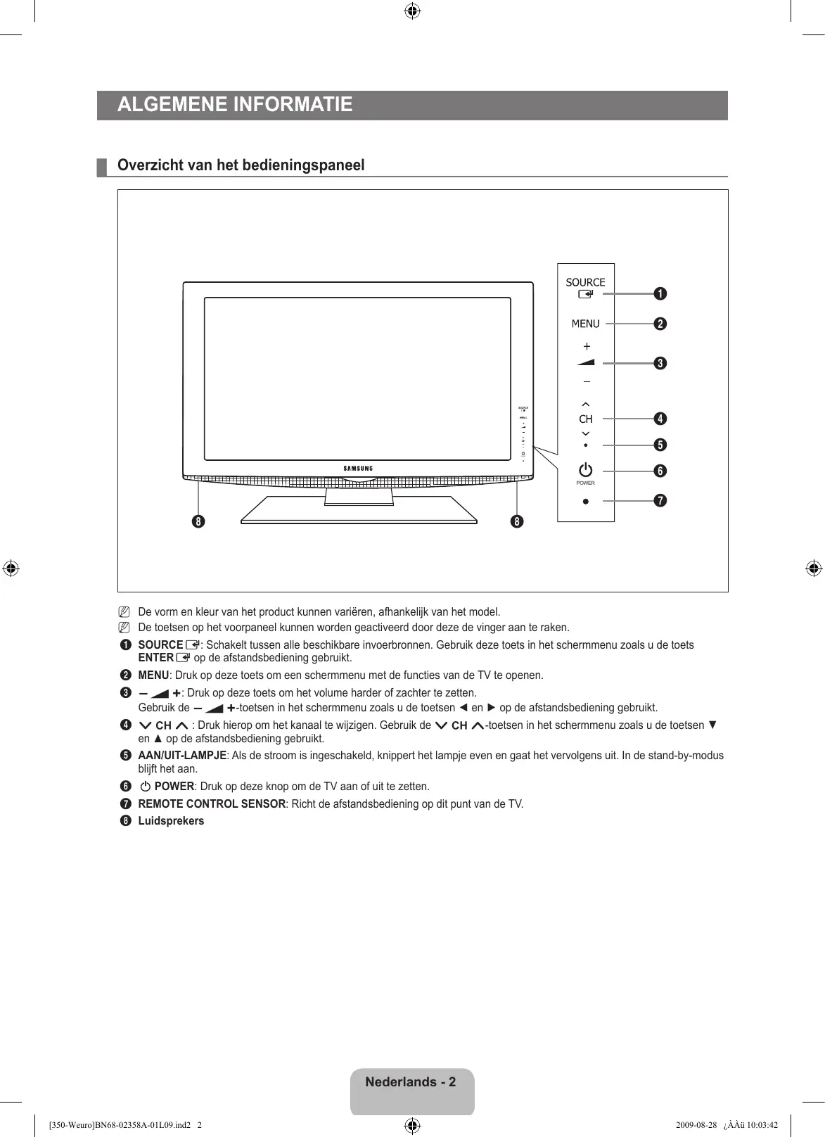 - ❑ Voorzorgsmaatregelen bij weergave van stilstaand beeld Stilstaande beelden kunnen permanente schade aan uw TV-scherm toebrengen ● Laat niet langer dan 2 uur een stilstaand of gedeeltelijk stilstaand beeld op het LCD-scherm staan, dat kan namelijk beeldretentie veroorzaken. Beeldretentie wordt ook wel inbranden genoemd. Verlaag bij de weergave van een stilstaand beeld de helderheid en het contrast om beeldretentie te voorkomen. Als u gedurende langere tijd naar uw LCD-tv kijkt terwijl het beeld in 4:3-formaat wordt weergegeven, kunnen aan de linker- en rechterkant en in het midden van het scherm randen achterblijven. Dit wordt veroorzaakt door de verschillen in lichtemissie op het scherm. Schade ontstaan door het bovengenoemde effect valt niet onder de garantie. ● Het gedurende langere tijd weergeven van stilstaande beelden van dvd’s of computerspellen kan (gedeeltelijke) scherminbranding tot gevolg hebben. Om dit te voorkomen kunt u tijdens het weergeven van stilstaande beelden de helderheid en het contrast verminderen. © 2009 Samsung Electronics Co., Ltd. All rights reserved. [350-Weuro]BN68-02358A-01L09.ind1 1 2009-08-28 ¿ÀÀü 10:03:41 Inhoud ALGEMENE INFORMATIE ■ Overzicht van het bedieningspaneel p. 2