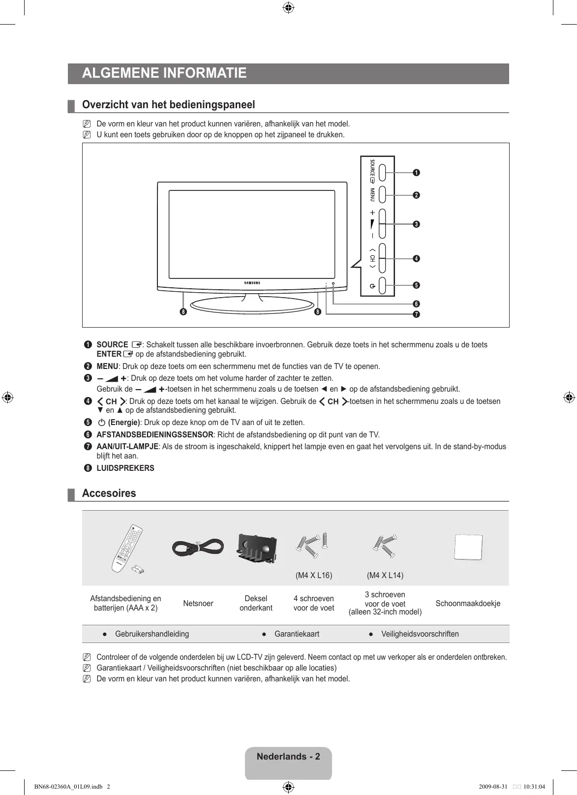 1 SOURCE E: Schakelt tussen alle beschikbare invoerbronnen. Gebruik deze toets in het schermmenu zoals u de toets ENTERE op de afstandsbediening gebruikt. 2 MENU: Druk op deze toets om een schermmenu met de functies van de TV te openen. 3 Y: Druk op deze toets om het volume harder of zachter te zetten. Gebruik de Y-toetsen in het schermmenu zoals u de toetsen ◄ en ► op de afstandsbediening gebruikt. 4 Z: Druk op deze toets om het kanaal te wijzigen. Gebruik de Z-toetsen in het schermmenu zoals u de toetsen ▼ en ▲ op de afstandsbediening gebruikt. 5 P (Energie): Druk op deze knop om de TV aan of uit te zetten. 6 AFSTANDSBEDIENINGSSENSOR: Richt de afstandsbediening op dit punt van de TV. 7 AAN/UIT-LAMPJE: Als de stroom is ingeschakeld, knippert het lampje even en gaat het vervolgens uit. In de stand-by-modus blijft het aan. 8 LUIDSPREKERS ¦ Accesoires Afstandsbediening en batterijen (AAA x 2) Netsnoer ● Gebruikershandleiding Deksel onderkant (M4 X L16) (M4 X L14) 4 schroeven voor de voet 3 schroeven voor de voet (alleen 32-inch model) ● Garantiekaart Schoonmaakdoekje ● Veiligheidsvoorschriften N Controleer of de volgende onderdelen bij uw LCD-TV zijn geleverd. Neem contact op met uw verkoper als er onderdelen ontbreken. N Garantiekaart / Veiligheidsvoorschriften (niet beschikbaar op alle locaties) N De vorm en kleur van het product kunnen variëren, afhankelijk van het model. Nederlands - BN68-02360A_01L09.indb 2 2009-08-31 10:31:04 ¦ Overzicht van het aansluitpaneel [Achterpaneel tv]