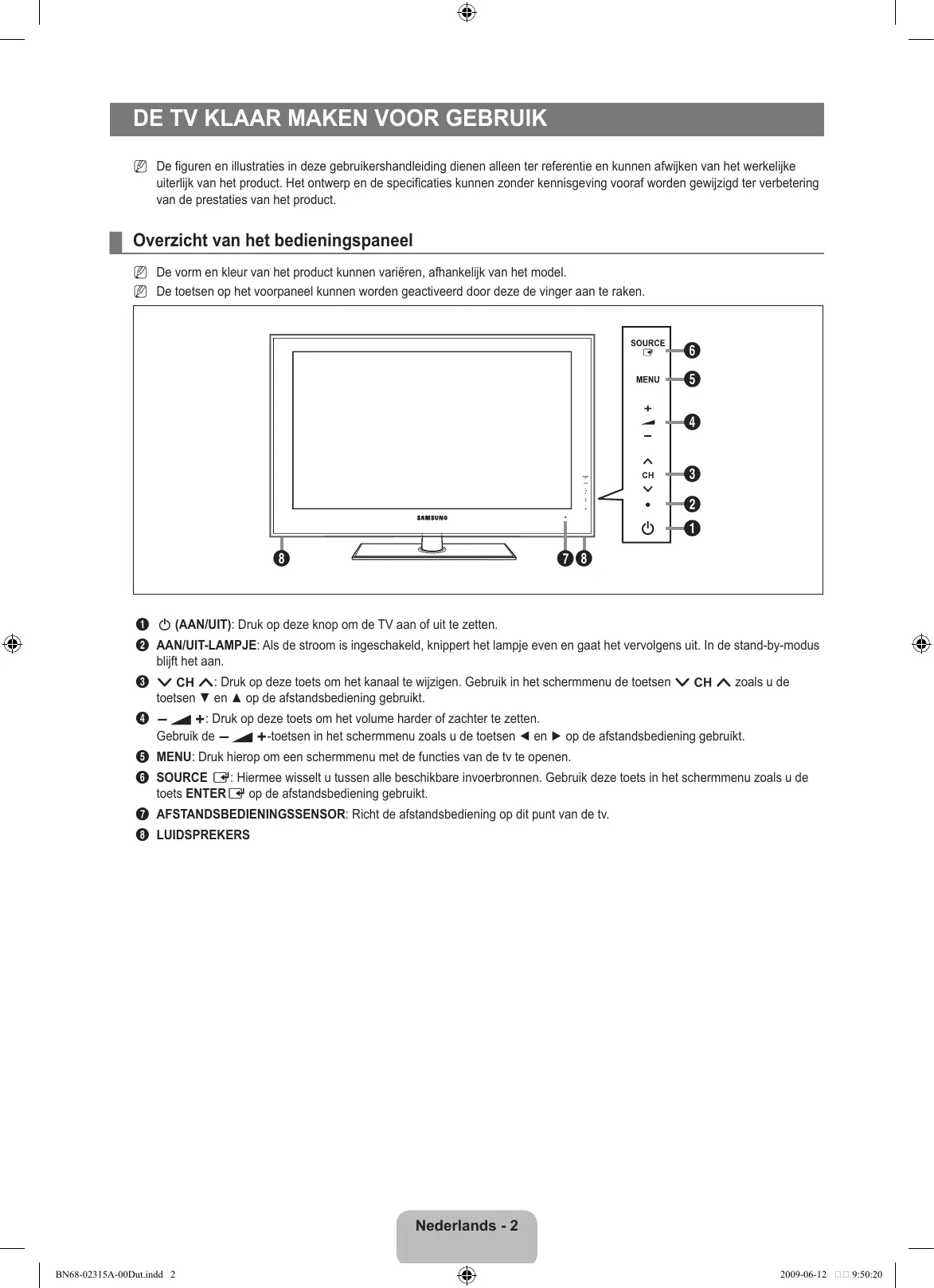 De toets TOOLS Indrukken Nederlands - BN68-02315A-00Dut.indd 1 2009-06-12 9:50:20 De tv klaar maken voor gebruik N De figuren en illustraties in deze gebruikershandleiding dienen alleen ter referentie en kunnen afwijken van het werkelijke uiterlijk van het product. Het ontwerp en de specificaties kunnen zonder kennisgeving vooraf worden gewijzigd ter verbetering van de prestaties van het product. ¦ Overzicht van het bedieningspaneel N De vorm en kleur van het product kunnen variëren, afhankelijk van het model. N De toetsen op het voorpaneel kunnen worden geactiveerd door deze de vinger aan te raken.
