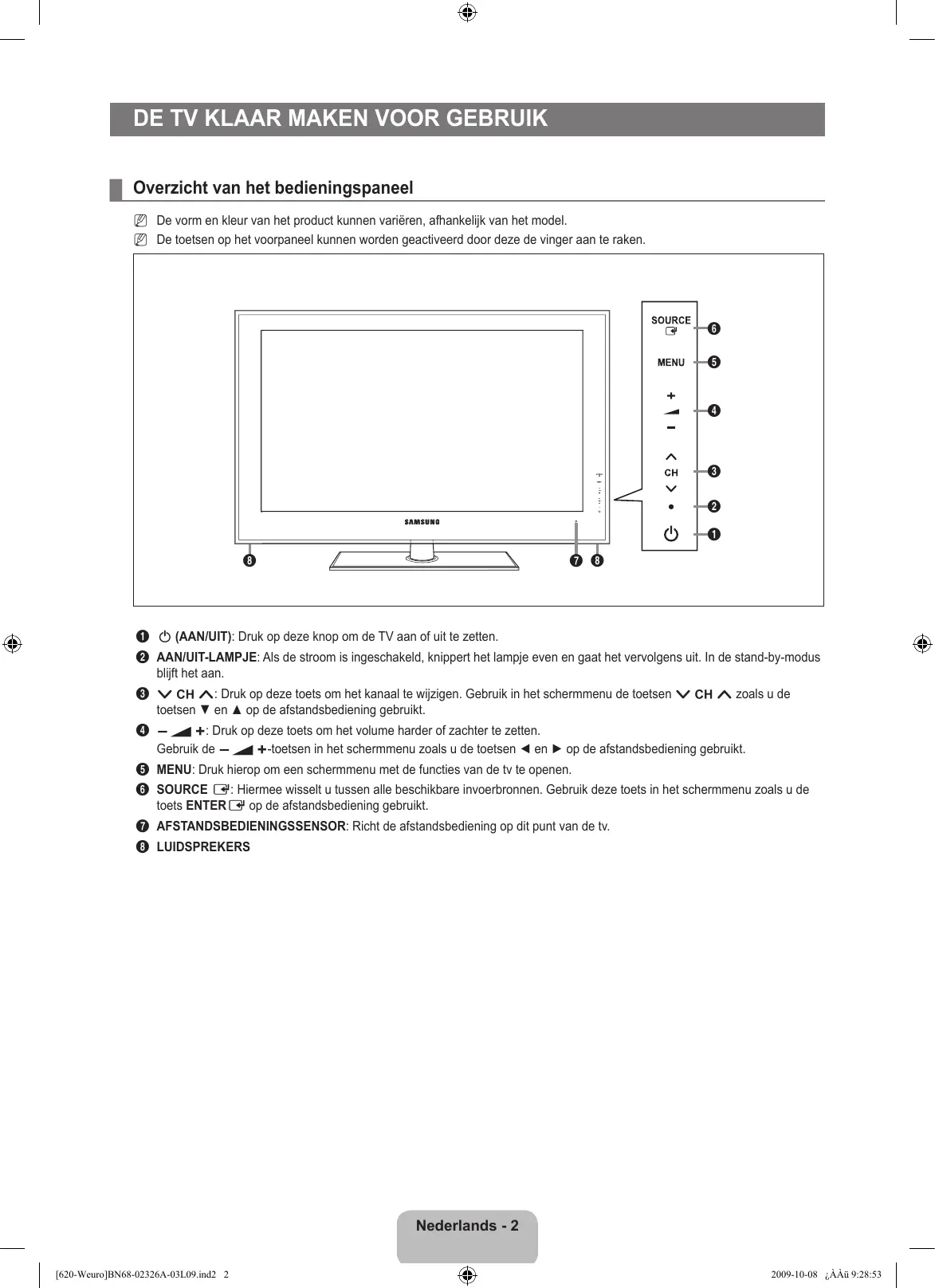 - ❑ Voorzorgsmaatregelen bij weergave van stilstaand beeld Stilstaande beelden kunnen permanente schade aan uw tv-scherm toebrengen ● Laat niet langer dan 2 uur een stilstaand of gedeeltelijk stilstaand beeld op het LCD-scherm staan, dat kan namelijk beeldretentie veroorzaken. Beeldretentie wordt ook wel inbranden genoemd. Verlaag bij de weergave van een stilstaand beeld de helderheid en het contrast om beeldretentie te voorkomen. Als u gedurende langere tijd naar uw LCD-tv kijkt terwijl het beeld in 4:3-formaat wordt weergegeven, kunnen aan de linker- en rechterkant en in het midden van het scherm randen achterblijven. Dit wordt veroorzaakt door de verschillen in lichtemissie op het scherm. Schade ontstaan door het bovengenoemde effect valt niet onder de garantie. ● Het gedurende langere tijd weergeven van stilstaande beelden van dvd’s of computerspellen kan (gedeeltelijke) scherminbranding tot gevolg hebben. Om dit te voorkomen kunt u tijdens het weergeven van stilstaande beelden de ‘helderheid’ en het ‘contrast’ verminderen. © 2009 Samsung Electronics Co., Ltd. All rights reserved. [620-Weuro]BN68-02326A-03L09.ind1 1 2009-10-08 ¿ÀÀü 9:28:53 Inhoud ANYNET+ De tv klaar maken voor gebruik ■ Overzicht van het bedieningspaneel p. 2