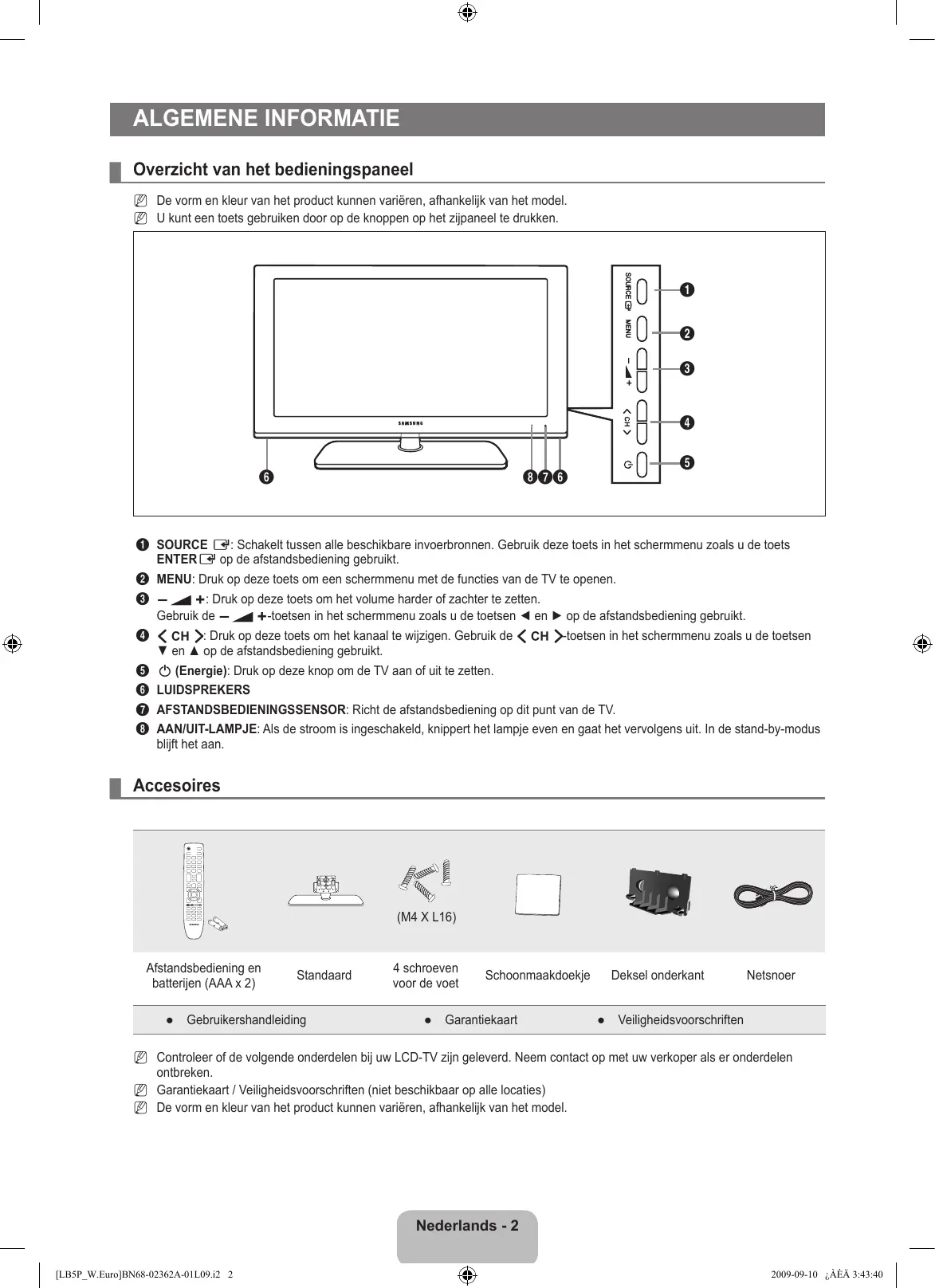 - ❑ Voorzorgsmaatregelen bij weergave van stilstaand beeld Stilstaande beelden kunnen permanente schade aan uw TV-scherm toebrengen ● Laat niet langer dan 2 uur een stilstaand of gedeeltelijk stilstaand beeld op het LCD-scherm staan, dat kan namelijk beeldretentie veroorzaken. Beeldretentie wordt ook wel inbranden genoemd. Verlaag bij de weergave van een stilstaand beeld de helderheid en het contrast om beeldretentie te voorkomen. Als u gedurende langere tijd naar uw LCD-tv kijkt terwijl het beeld in 4:3-formaat wordt weergegeven, kunnen aan de linker- en rechterkant en in het midden van het scherm randen achterblijven. Dit wordt veroorzaakt door de verschillen in lichtemissie op het scherm. Schade ontstaan door het bovengenoemde effect valt niet onder de garantie. ● Het gedurende langere tijd weergeven van stilstaande beelden van dvd’s of computerspellen kan (gedeeltelijke) scherminbranding tot gevolg hebben. Om dit te voorkomen kunt u tijdens het weergeven van stilstaande beelden de helderheid en het contrast verminderen. © 2009 Samsung Electronics Co., Ltd. All rights reserved. [LB5P_W.Euro]BN68-02362A-01L09.i1 1 2009-09-10 ¿ÀÈÄ 3:43:39 Inhoud ALGEMENE INFORMATIE INSTELLINGEN ■ Overzicht van het bedieningspaneel p. 2