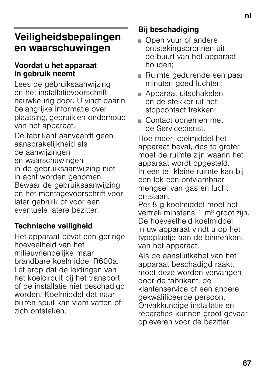 nlInhoudnlGebruiksa nwijzng Veiligheidsbepalingen en waarschuwingen Voordat u het apparaat in gebruik neemt Lees de gebruiksaanwijzing en het installatievoorschrift nauwkeurig door. U vindt daarin belangrijke informatie over plaatsing, gebruik en onderhoud van het apparaat. De fabrikant aanvaardt geen aansprakelijkheid als de aanwijzingen en waarschuwingen in de gebruiksaanwijzing niet in acht worden genomen. Bewaar de gebruiksaanwijzing en het montagevoorschrift voor later gebruik of voor een eventuele latere bezitter. Technische veiligheid Het apparaat bevat een geringe hoeveelheid van het milieuvriendelijke maar brandbare koelmiddel R600a. Let erop dat de leidingen van het koelcircuit bij het transport of de installatie niet beschadigd worden. Koelmiddel dat naar buiten spuit kan vlam vatten of zich ontsteken. Bij beschadiging ■ Open vuur of andere ontstekingsbronnen uit de buurt van het apparaat houden; ■ Ruimte gedurende een paar minuten goed luchten; ■ Apparaat uitschakelen en de stekker uit het stopcontact trekken; ■ Contact opnemen met de Servicedienst. Hoe meer koelmiddel het apparaat bevat, des te groter moet de ruimte zijn waarin het apparaat wordt opgesteld. In een te kleine ruimte kan bij een lek een ontvlambaar mengsel van gas en lucht ontstaan. Per 8 g koelmiddel moet het vertrek minstens 1 m³ groot zijn. De hoeveelheid koelmiddel in uw apparaat vindt u op het typeplaatje aan de binnenkant van het apparaat. Als de aansluitkabel van het apparaat beschadigd raakt, moet deze worden vervangen door de fabrikant, de klantenservice of een andere gekwalificeerde persoon. Onvakkundige installatie en reparaties kunnen groot gevaar opleveren voor de bezitter.