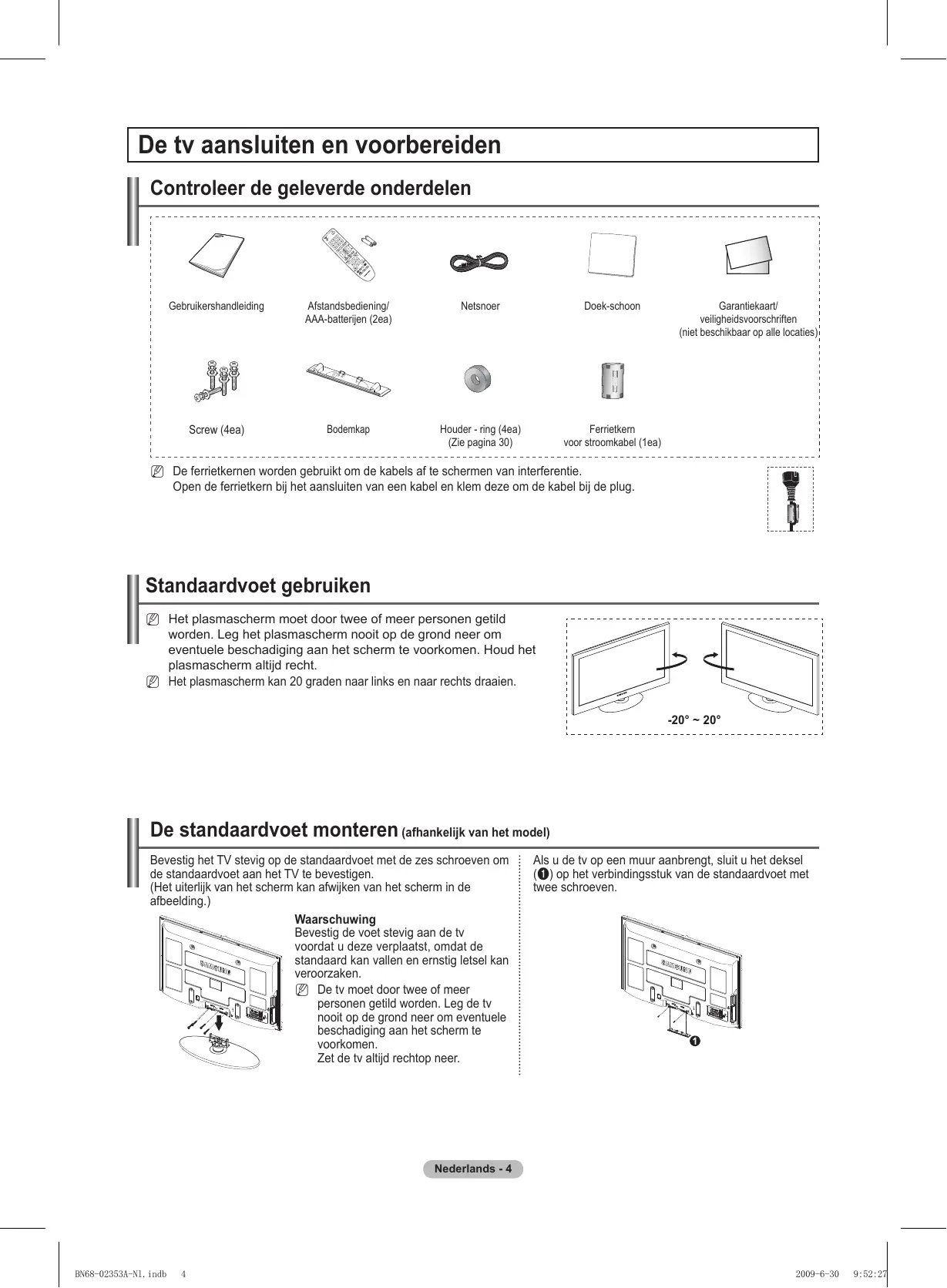 2009-6-30 9:52:24 De tv aansluiten en voorbereiden Controleer de geleverde onderdelen Gebruikershandleiding Afstandsbediening/ AAA-batterijen (2ea) Netsnoer Doek-schoon Screw (4ea) Bodemkap Houder - ring (4ea) (Zie pagina 30) Ferrietkern voor stroomkabel (1ea) Garantiekaart/ veiligheidsvoorschriften (niet beschikbaar op alle locaties) N De ferrietkernen worden gebruikt om de kabels af te schermen van interferentie. Open de ferrietkern bij het aansluiten van een kabel en klem deze om de kabel bij de plug. Standaardvoet gebruiken N Het plasmascherm moet door twee of meer personen getild worden. Leg het plasmascherm nooit op de grond neer om eventuele beschadiging aan het scherm te voorkomen. Houd het plasmascherm altijd recht. N Het plasmascherm kan 20 graden naar links en naar rechts draaien. -20° ~ 20° De standaardvoet monteren (afhankelijk van het model) Bevestig het TV stevig op de standaardvoet met de zes schroeven om de standaardvoet aan het TV te bevestigen. (Het uiterlijk van het scherm kan afwijken van het scherm in de afbeelding.) Waarschuwing Bevestig de voet stevig aan de tv voordat u deze verplaatst, omdat de standaard kan vallen en ernstig letsel kan veroorzaken. N De tv moet door twee of meer personen getild worden. Leg de tv nooit op de grond neer om eventuele beschadiging aan het scherm te voorkomen. Zet de tv altijd rechtop neer. Als u de tv op een muur aanbrengt, sluit u het deksel (1) op het verbindingsstuk van de standaardvoet met twee schroeven. Nederlands - BN68-02353A-Nl.indb