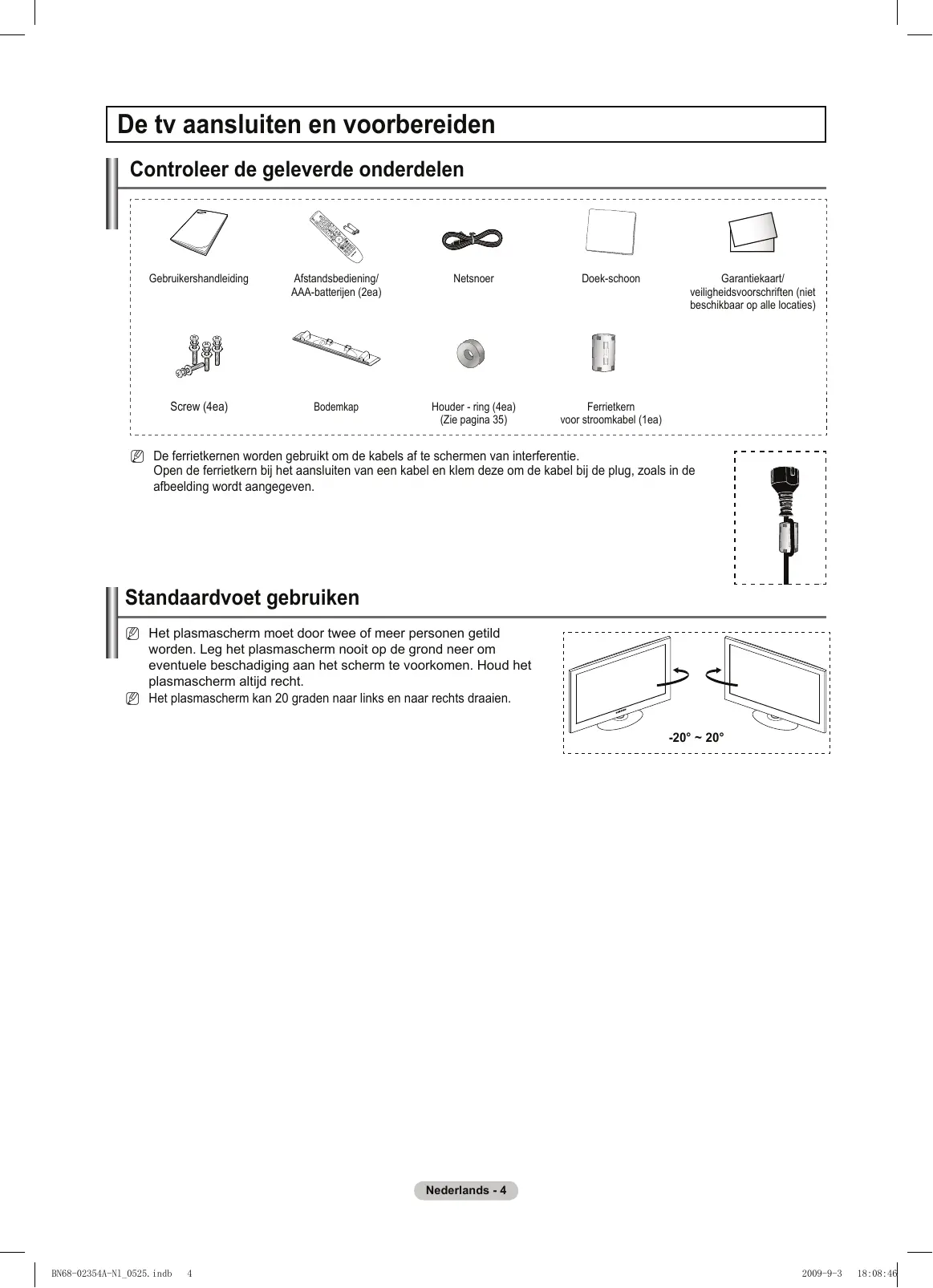 - 2009-10-23 15:43:07 Inhoud De tv aansluiten en voorbereiden Beschrijving van de functies ■ Controleer de geleverde onderdelen p. 4
