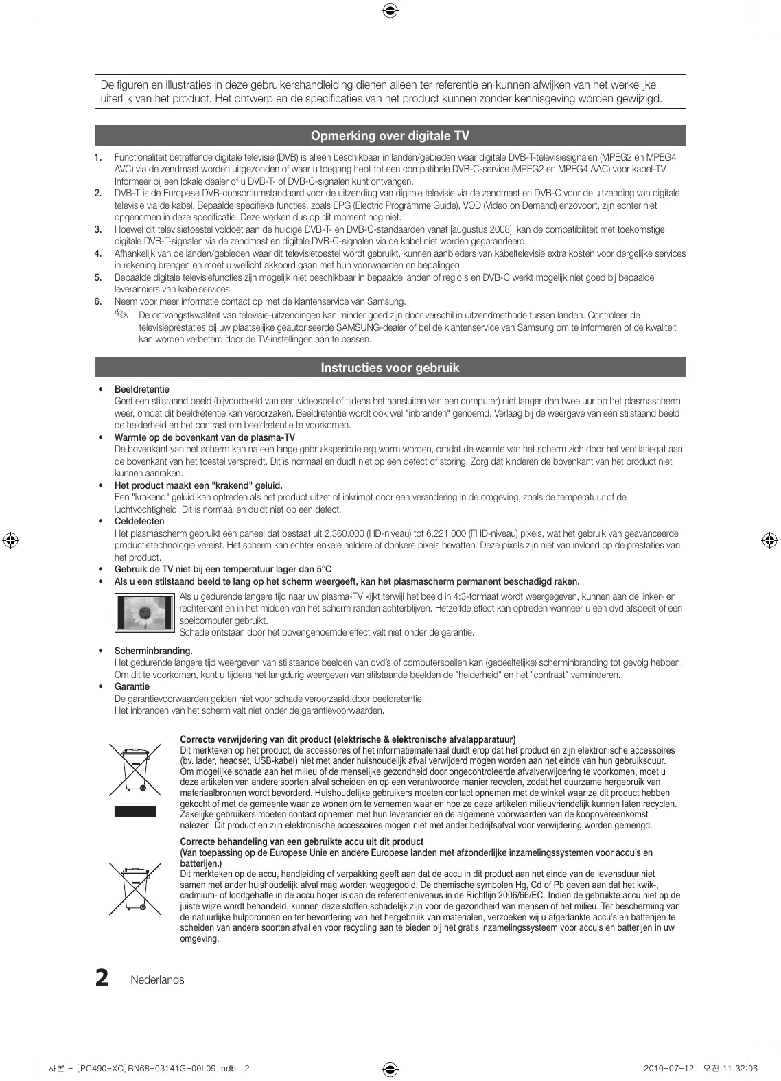 2010-07-12 오전 11:32:04 De figuren en illustraties in deze gebruikershandleiding dienen alleen ter referentie en kunnen afwijken van het werkelijke uiterlijk van het product. Het ontwerp en de specificaties van het product kunnen zonder kennisgeving worden gewijzigd. Opmerking over digitale TV