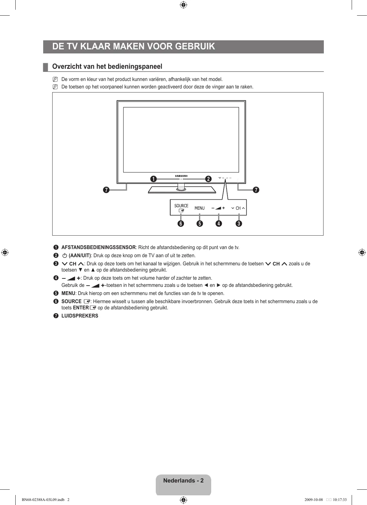 - ❑ Voorzorgsmaatregelen bij weergave van stilstaand beeld Stilstaande beelden kunnen permanente schade aan uw tv-scherm toebrengen ● Laat niet langer dan 2 uur een stilstaand of gedeeltelijk stilstaand beeld op het LED-scherm staan, dat kan namelijk beeldretentie veroorzaken. Beeldretentie wordt ook wel inbranden genoemd. Verlaag bij de weergave van een stilstaand beeld de helderheid en het contrast om beeldretentie te voorkomen. Als u gedurende langere tijd naar uw LED-tv kijkt terwijl het beeld in 4:3-formaat wordt weergegeven, kunnen aan de linker- en rechterkant en in het midden van het scherm randen achterblijven. Dit wordt veroorzaakt door de verschillen in lichtemissie op het scherm. Schade ontstaan door het bovengenoemde effect valt niet onder de garantie. ● Het gedurende langere tijd weergeven van stilstaande beelden van dvd’s of computerspellen kan (gedeeltelijke) scherminbranding tot gevolg hebben. Om dit te voorkomen kunt u tijdens het weergeven van stilstaande beelden de ‘helderheid’ en het ‘contrast’ verminderen. © 2009 Samsung Electronics Co., Ltd. All rights reserved. BN68-02388A-03L09.indb 1 2009-10-08 10:17:32 Inhoud Media Play (USB) De tv klaar maken voor gebruik ■ Overzicht van het bedieningspaneel p. 2
