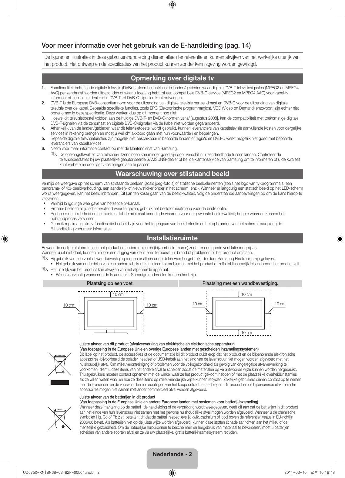 - Wees voorzichtig wanneer u de tv aanraakt. Sommige onderdelen kunnen heet zijn. Plaatsing op een voet. Plaatsing met een wandbevestiging. 10 cm 10 cm 10 cm 10 cm 10 cm 10 cm 10 cm Juiste afvoer van dit product (afvalverwerking van elektrische en elektronische apparatuur) (Van toepassing in de Europese Unie en overige Europese landen met gescheiden inzamelingssystemen) Dit label op het product, de accessoires of de documentatie bij dit product duidt erop dat het product en de bijbehorende elektronische accessoires (bijvoorbeeld de oplader, headset of USB-kabel) aan het eind van de levensduur niet mogen worden afgevoerd met het huishoudelijk afval. Om milieuverontreiniging of problemen voor de volksgezondheid als gevolg van ongeregelde afvalverwerking te voorkomen, dient u deze items van het andere afval te scheiden zodat de materialen op verantwoorde wijze kunnen worden hergebruikt. Thuisgebruikers moeten contact opnemen met de winkel waar ze het product gekocht hebben of met de plaatselijke overheidsinstanties als ze willen weten waar en hoe ze deze items op milieuvriendelijke wijze kunnen recyclen. Zakelijke gebruikers dienen contact op te nemen met de leverancier en de voorwaarden en bepalingen van het koopcontract te raadplegen. Dit product en de bijbehorende elektronische accessoires mogen niet samen met ander commercieel afval worden afgevoerd. Juiste afvoer van de batterijen in dit product (Van toepassing in de Europese Unie en andere Europese landen met systemen voor batterij-inzameling) Wanneer deze markering op de batterij, de handleiding of de verpakking wordt weergegeven, geeft dit aan dat de batterijen in dit product aan het einde van hun levensduur niet samen met het gewone huishoudelijke afval mogen worden afgevoerd. Wanneer u de chemische symbolen Hg, Cd of Pb ziet, betekent dit dat de batterij respectievelijk kwik, cadmium of lood boven de referentieniveaus in EU-richtlijn 2006/66 bevat. Als batterijen niet op de juiste wijze worden afgevoerd, kunnen deze stoffen schade aanrichten aan het milieu of de menselijke gezondheid. Om de natuurlijke hulpbronnen te beschermen en hergebruik van materiaal te bevorderen, moet u batterijen scheiden van andere soorten afval en ze via uw plaatselijke, gratis batterij-inzamelsysteem recyclen. Nederlands - 2 [UD6750-XN]BN68-03482F-00L04.indb 2 2011-03-10 오후 10:19:48 Accessoires ✎✎Controleer of de volgende onderdelen bij uw tv geleverd zijn. Neem contact op met uw verkoper als er onderdelen ontbreken. ✎✎De vorm en kleur van de items kunnen enigszins afwijken. Dit is afhankelijk van het model. ✎✎Kabels die niet bij het product worden geleverd, kunnen apart worden aangeschaft. ✎✎Controleer of er geen accessoire is achtergebleven in het verpakkingsmateriaal in de doos. [[LET OP: STEVIG BEVESTIGEN ZODAT DE ADAPTER GOED IS VASTGEKOPPELD