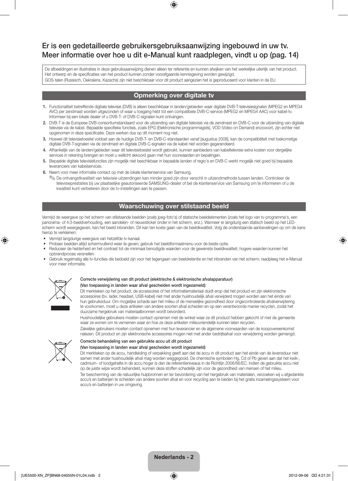 - • Dieses Gerät kann in allen Ländern in der EU verwendet werden. Deutsch - 23 [UE5500-XN_ZF]BN68-04055N-01L04.indb 23 2012-09-06 4:21:31 Er is een gedetailleerde gebruikersgebruiksaanwijzing ingebouwd in uw tv. Meer informatie over hoe u dit e-Manual kunt raadplegen, vindt u op (pag. 14) De afbeeldingen en illustraties in deze gebruiksaanwijzing dienen alleen ter referentie en kunnen afwijken van het werkelijke uiterlijk van het product. Het ontwerp en de specificaties van het product kunnen zonder voorafgaande kennisgeving worden gewijzigd. GOS-talen (Russisch, Oekraïens, Kazachs) zijn niet beschikbaar voor dit product aangezien het is geproduceerd voor klanten in de EU. Opmerking over digitale tv 1. Functionaliteit betreffende digitale televisie (DVB) is alleen beschikbaar in landen/gebieden waar digitale DVB-T-televisiesignalen (MPEG2 en MPEG4 AVC) per zendmast worden uitgezonden of waar u toegang hebt tot een compatibele DVB-C-service (MPEG2 en MPEG4 AAC) voor kabel-tv. Informeer bij een lokale dealer of u DVB-T- of DVB-C-signalen kunt ontvangen. 2. DVB-T is de Europese DVB-consortiumstandaard voor de uitzending van digitale televisie via de zendmast en DVB-C voor de uitzending van digitale televisie via de kabel. Bepaalde specifieke functies, zoals EPG (Elektronische programmagids), VOD (Video on Demand) enzovoort, zijn echter niet opgenomen in deze specificatie. Deze werken dus op dit moment nog niet. 3. Hoewel dit televisietoestel voldoet aan de huidige DVB-T- en DVB-C-standaarden vanaf [augustus 2008], kan de compatibiliteit met toekomstige digitale DVB-T-signalen via de zendmast en digitale DVB-C-signalen via de kabel niet worden gegarandeerd. 4. Afhankelijk van de landen/gebieden waar dit televisietoestel wordt gebruikt, kunnen aanbieders van kabeltelevisie extra kosten voor dergelijke services in rekening brengen en moet u wellicht akkoord gaan met hun voorwaarden en bepalingen. 5. Bepaalde digitale televisiefuncties zijn mogelijk niet beschikbaar in bepaalde landen of regio's en DVB-C werkt mogelijk niet goed bij bepaalde leveranciers van kabelservices.