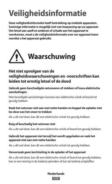 Veiligheidsinformatie Deze veiligheidsinformatie heeft betrekking op mobiele apparaten. Sommige informatie is mogelijk niet van toepassing op uw apparaat. Om letsel aan uzelf en anderen of schade aan het apparaat te voorkomen, moet u de veiligheidsinformatie over uw apparaat lezen voordat u het apparaat gebruikt. Waarschuwing Het niet opvolgen van de veiligheidswaarschuwingen en -voorschriften kan leiden tot ernstig letsel of de dood Gebruik geen beschadigde netsnoeren of stekkers of losse elektrische aansluitingen Niet-beveiligde aansluitingen kunnen een elektrische schok of brand tot gevolg hebben. Raak het netsnoer niet aan met natte handen en koppel de oplader niet los door aan het snoer te trekken Als u dit wel doet, kan dit een elektrische schok tot gevolg hebben. Buig of beschadig het netsnoer niet Als u dit wel doet, kan dit een elektrische schok of brand tot gevolg hebben. Gebruik het apparaat niet terwijl het wordt opgeladen en raak het apparaat niet aan met natte handen Als u dit wel doet, kan dit een elektrische schok tot gevolg hebben. Veroorzaak geen kortsluiting in de oplader of het apparaat Als u dit wel doet, kan dit een elektrische schok of brand tot gevolg hebben, kan er een storing in de batterij optreden of kan de batterij ontploffen. Nederlands
