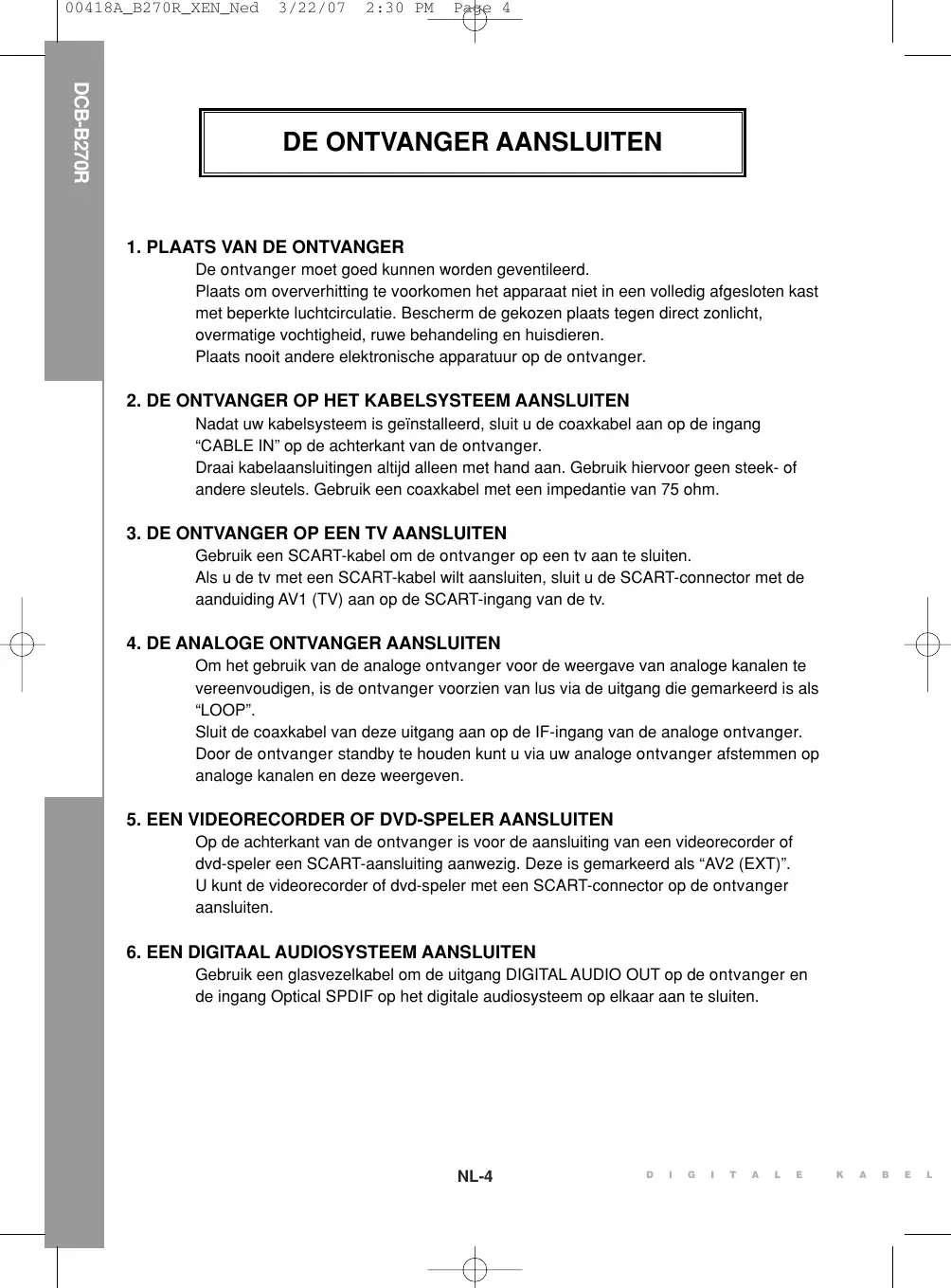2. DE ONTVANGER OP HET KABELSYSTEEM AANSLUITEN