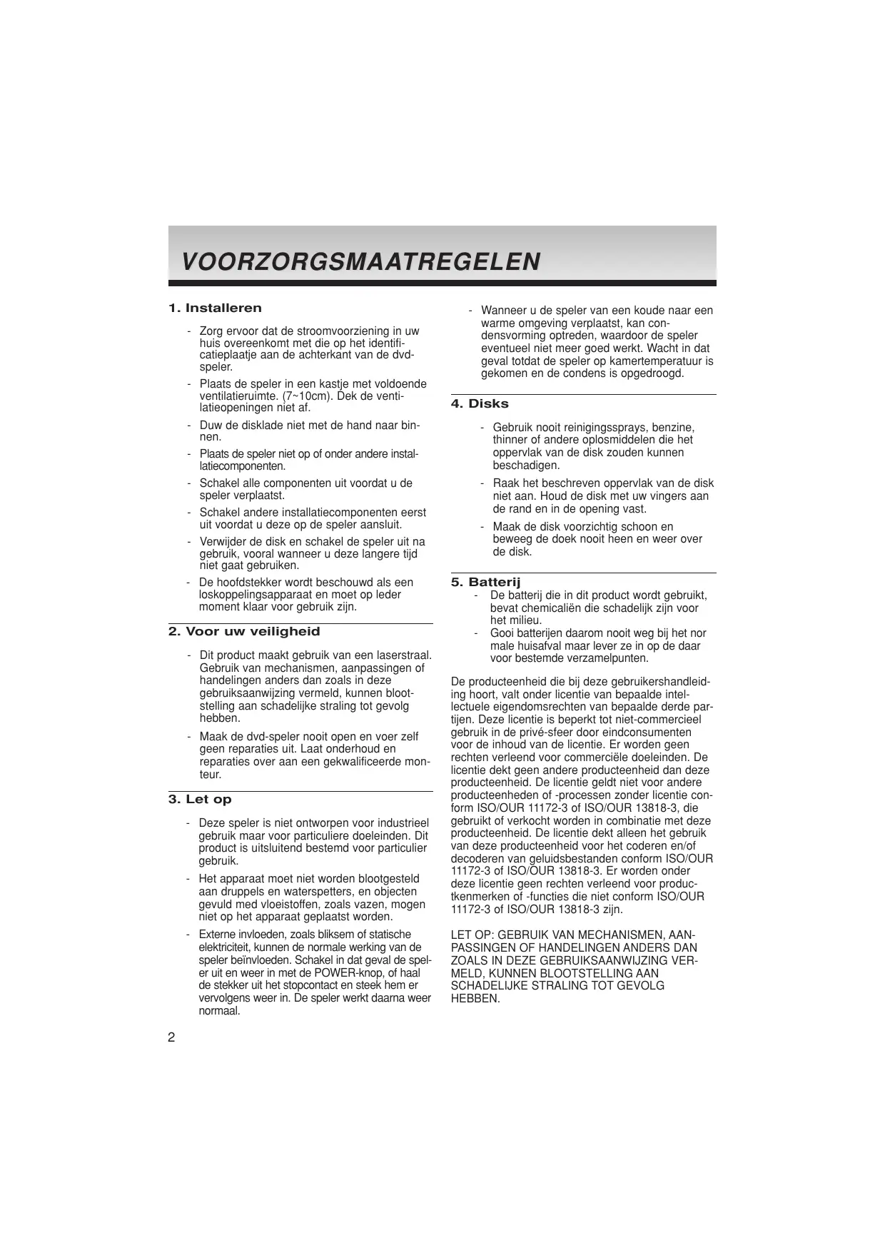 - De batterij die in dit product wordt gebruikt, bevat chemicaliën die schadelijk zijn voor het milieu. - Gooi batterijen daarom nooit weg bij het nor male huisafval maar lever ze in op de daar voor bestemde verzamelpunten. De producteenheid die bij deze gebruikershandleiding hoort, valt onder licentie van bepaalde intellectuele eigendomsrechten van bepaalde derde partijen. Deze licentie is beperkt tot niet-commercieel gebruik in de privé-sfeer door eindconsumenten voor de inhoud van de licentie. Er worden geen rechten verleend voor commerciële doeleinden. De licentie dekt geen andere producteenheid dan deze producteenheid. De licentie geldt niet voor andere producteenheden of -processen zonder licentie conform ISO/OUR 11172-3 of ISO/OUR 13818-3, die gebruikt of verkocht worden in combinatie met deze producteenheid. De licentie dekt alleen het gebruik van deze producteenheid voor het coderen en/of decoderen van geluidsbestanden conform ISO/OUR 11172-3 of ISO/OUR 13818-3. Er worden onder deze licentie geen rechten verleend voor productkenmerken of -functies die niet conform ISO/OUR 11172-3 of ISO/OUR 13818-3 zijn. LET OP: GEBRUIK VAN MECHANISMEN, AANPASSINGEN OF HANDELINGEN ANDERS DAN ZOALS IN DEZE GEBRUIKSAANWIJZING VERMELD, KUNNEN BLOOTSTELLING AAN