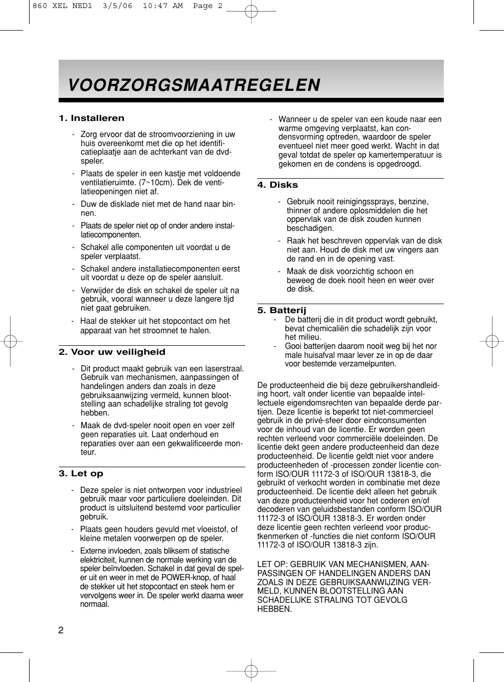 - De batterij die in dit product wordt gebruikt, bevat chemicaliën die schadelijk zijn voor het milieu. - Gooi batterijen daarom nooit weg bij het nor male huisafval maar lever ze in op de daar voor bestemde verzamelpunten. De producteenheid die bij deze gebruikershandleiding hoort, valt onder licentie van bepaalde intellectuele eigendomsrechten van bepaalde derde partijen. Deze licentie is beperkt tot niet-commercieel gebruik in de privé-sfeer door eindconsumenten voor de inhoud van de licentie. Er worden geen rechten verleend voor commerciële doeleinden. De licentie dekt geen andere producteenheid dan deze producteenheid. De licentie geldt niet voor andere producteenheden of -processen zonder licentie conform ISO/OUR 11172-3 of ISO/OUR 13818-3, die gebruikt of verkocht worden in combinatie met deze producteenheid. De licentie dekt alleen het gebruik van deze producteenheid voor het coderen en/of decoderen van geluidsbestanden conform ISO/OUR 11172-3 of ISO/OUR 13818-3. Er worden onder deze licentie geen rechten verleend voor productkenmerken of -functies die niet conform ISO/OUR 11172-3 of ISO/OUR 13818-3 zijn. LET OP: GEBRUIK VAN MECHANISMEN, AANPASSINGEN OF HANDELINGEN ANDERS DAN ZOALS IN DEZE GEBRUIKSAANWIJZING VERMELD, KUNNEN BLOOTSTELLING AAN