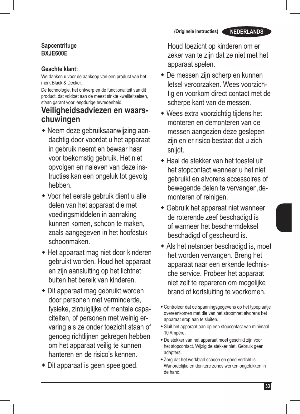 (Originele instructies) Sapcentrifuge BXJE600E Geachte klant: We danken u voor de aankoop van een product van het merk Black & Decker. De technologie, het ontwerp en de functionaliteit van dit product, dat voldoet aan de meest strikte kwaliteitseisen, staan garant voor langdurige tevredenheid. Veiligheidsadviezen en waarschuwingen Neem deze gebruiksaanwijzing aandachtig door voordat u het apparaat in gebruik neemt en bewaar haar voor toekomstig gebruik. Het niet opvolgen en naleven van deze instructies kan een ongeluk tot gevolg hebben. Voor het eerste gebruik dient u alle delen van het apparaat die met voedingsmiddelen in aanraking kunnen komen, schoon te maken, zoals aangegeven in het hoofdstuk schoonmaken. Het apparaat mag niet door kinderen gebruikt worden. Houd het apparaat en zijn aansluiting op het lichtnet buiten het bereik van kinderen. Dit apparaat mag gebruikt worden door personen met verminderde, fysieke, zintuiglijke of mentale capaciteiten, of personen met weinig ervaring als ze onder toezicht staan of genoeg richtlijnen gekregen hebben om het apparaat veilig te kunnen hanteren en de risico’s kennen. Dit apparaat is geen speelgoed. NEDERLANDS Houd toezicht op kinderen om er zeker van te zijn dat ze niet met het apparaat spelen. De messen zijn scherp en kunnen letsel veroorzaken. Wees voorzichtig en voorkom direct contact met de scherpe kant van de messen. Wees extra voorzichtig tijdens het monteren en demonteren van de messen aangezien deze geslepen zijn en er risico bestaat dat u zich snijdt. Haal de stekker van het toestel uit het stopcontact wanneer u het niet gebruikt en alvorens accessoires of bewegende delen te vervangen,demonteren of reinigen. Gebruik het apparaat niet wanneer de roterende zeef beschadigd is of wanneer het beschermdeksel beschadigd of gescheurd is. Als het netsnoer beschadigd is, moet het worden vervangen. Breng het apparaat naar een erkende technische service. Probeer het apparaat niet zelf te repareren om mogelijke brand of kortsluiting te voorkomen. Controleer dat de spanningsgegevens op het typeplaatje overeenkomen met die van het stroomnet alvorens het apparaat erop aan te sluiten. Sluit het apparaat aan op een stopcontact van minimaal 10 Ampère. De stekker van het apparaat moet geschikt zijn voor het stopcontact. Wijzig de stekker niet. Gebruik geen adapters. Zorg dat het werkblad schoon en goed verlicht is. Wanordelijke en donkere zones werken ongelukken in de hand.