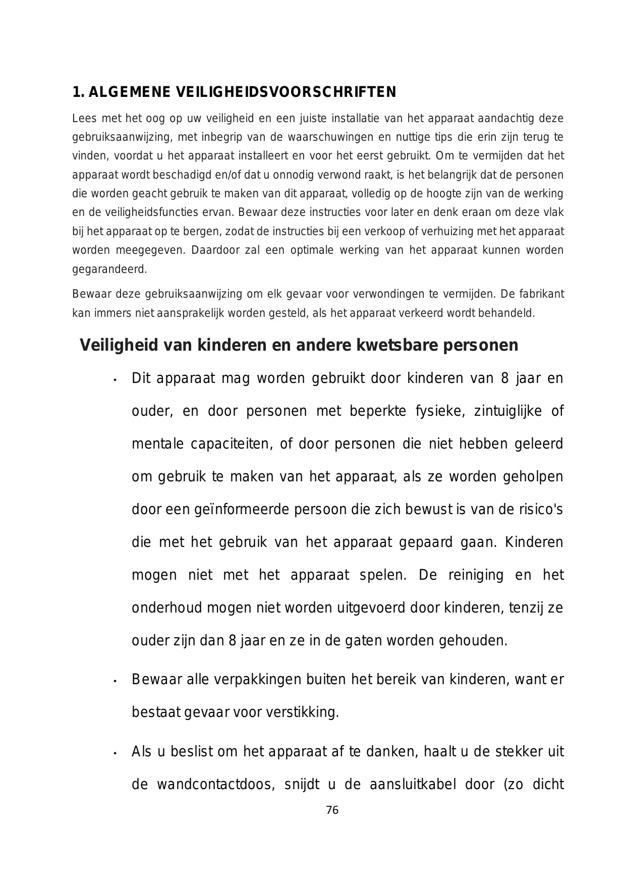 - Dit apparaat mag worden gezruikt door kinderen van 8aar en ouder, en door personen met beperkte fysieke, zintuiglijke of mentale capacitieten, of door personen die nicht hebben geleerd om gezruik te makev van het apparaat, als ze worden geholpen door een geinformeerde persoon die zich bewust is van de risico's die met het gezruik van het apparaat gepaard gaan. Kinderen mogen Niet met het apparaat spelen. De reiniging en het onderhoud mogen Niet worden uitgevoerd door kinderen, tenzij ze ouder+zijn dan 8aar en ze in de gaten worden gehonden.