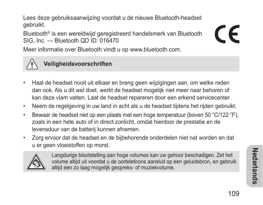 Lees deze gebruiksaanwijzing voordat u de nieuwe Bluetooth-headset gebruikt. Bluetooth® is een wereldwijd geregistreerd handelsmerk van Bluetooth SIG, Inc. — Bluetooth QD ID: 016470 Meer informatie over Bluetooth vindt u op www.bluetooth.com. Veiligheidsvoorschriften •
