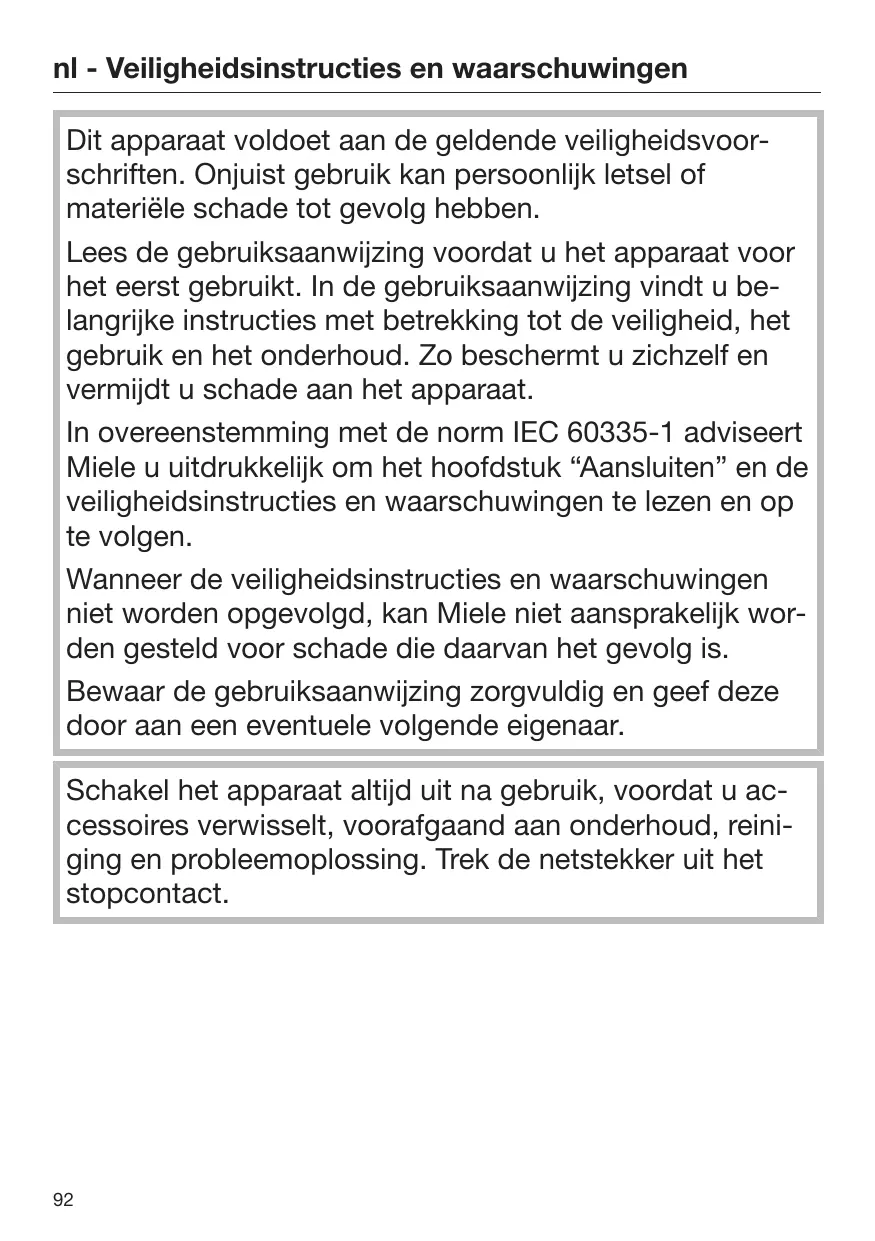 62 Conformément à la norme CEI 60335-1, Miele indique expressément de lire impérativement le chapitre « Raccordement » et de suivre les consignes de sécurité et de mise en garde. Miele ne peut être tenu pour responsable des dommages dus au non-respect des consignes. Conservez ce mode d'emploi et veuillez le remettre en cas de cession de cet appareil. Eteignez toujours l'aspirateur après utilisation et avant de le nettoyer, de changer d'accessoire, de résoudre une anomalie ou si vous souhaitez procéder à une opération de maintenance. Débranchez la fiche de la prise secteur. Utilisation conforme  Cet aspirateur est destiné à une utilisation à la maison ou de type domestique. Cet aspirateur ne doit pas être utilisé sur un chantier, en extérieur.  Cet aspirateur est conçu pour l'aspiration quotidienne des tapis, moquettes et sols durs peu fragiles. 49