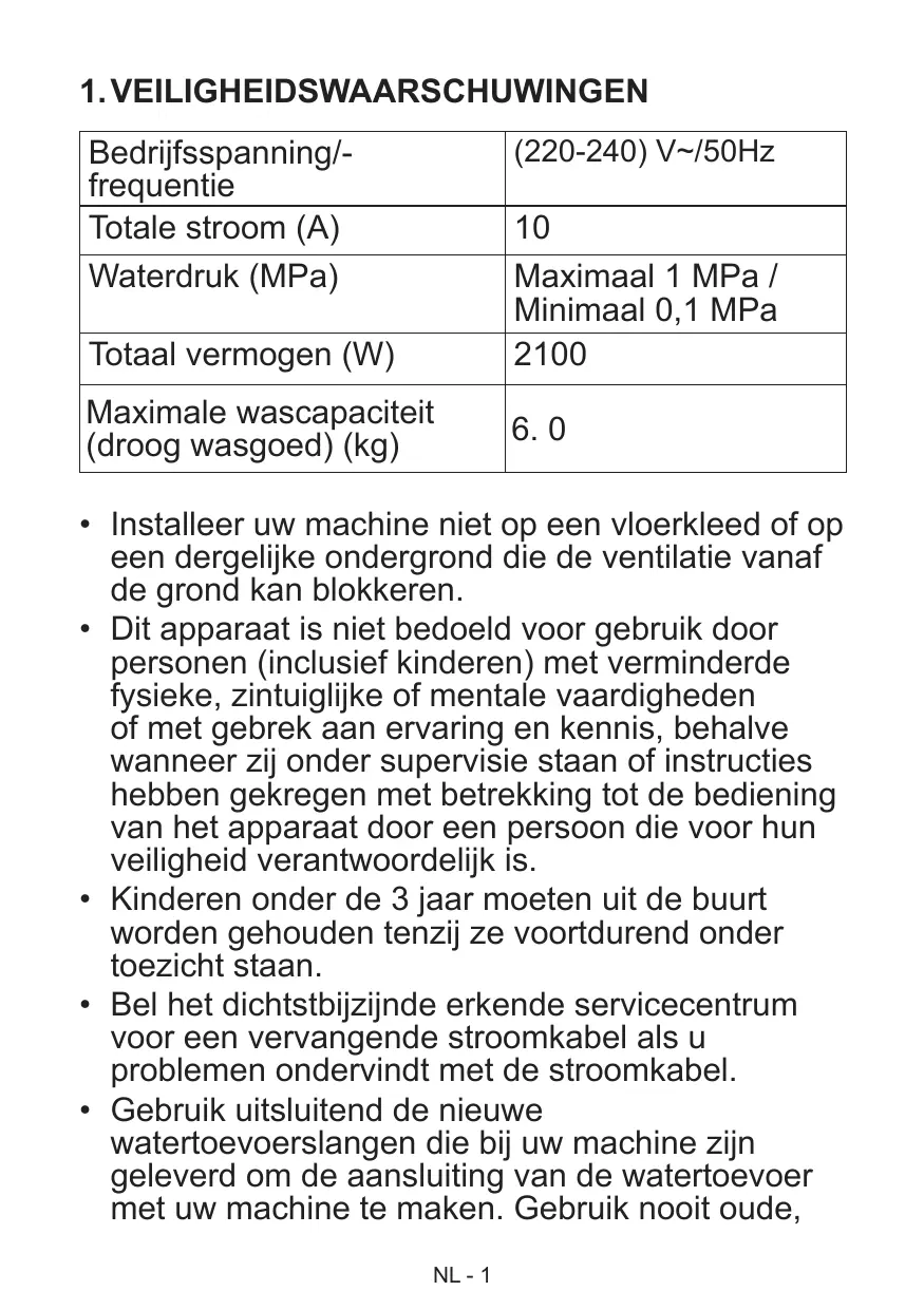 - Gebruik uitsluitend de nieuwe watertoevoerslangen die bij uw machine zijn geleverd om de aansluiting van de watertoevoer met uw machine te maken. Gebruik nooit oude, NL - 1 gebruikte of beschadigde watertoevoerslangen.