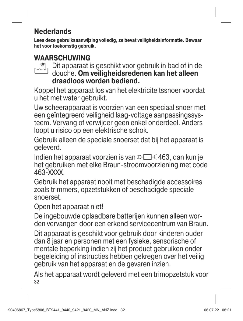 Uw scheerapparaat is voorzien van een special snoer met een geintegreerd veiligheid laag-voltage aanpassingssystem. Vervang of verwijder geen enkel onderdeel. Anders loopt u risico op een elektrische schok.