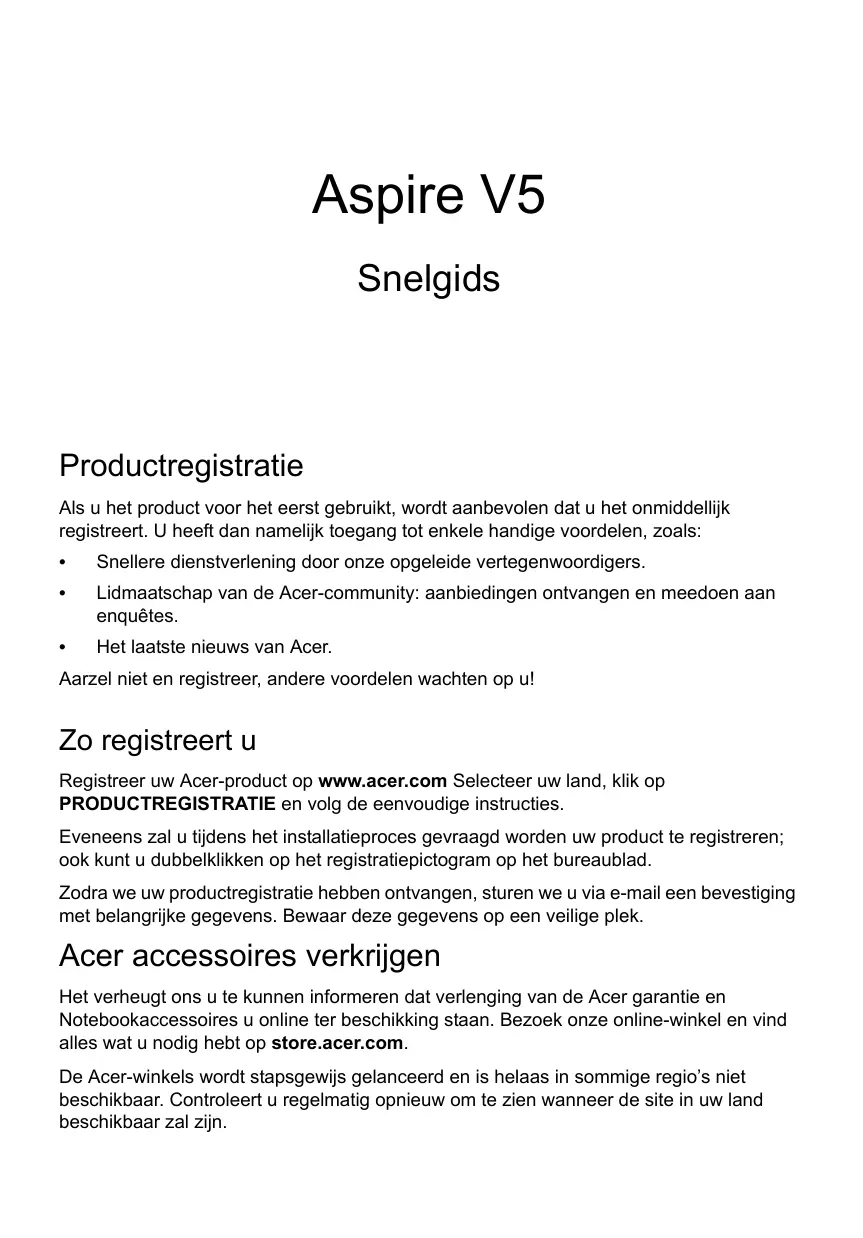 Het laatste nieuws van Acer. Aarzel niet en registreer, andere voordelen wachten op u! Zo registreert u Registreer uw Acer-product op www.acer.com Selecteer uw land, klik op PRODUCTREGISTRATIE en volg de eenvoudige instructies. Eveneens zal u tijdens het installatieproces gevraagd worden uw product te registreren; ook kunt u dubbelklikken op het registratiepictogram op het bureaublad. Zodra we uw productregistratie hebben ontvangen, sturen we u via e-mail een bevestiging met belangrijke gegevens. Bewaar deze gegevens op een veilige plek. Acer accessoires verkrijgen Het verheugt ons u te kunnen informeren dat verlenging van de Acer garantie en Notebookaccessoires u online ter beschikking staan. Bezoek onze online-winkel en vind alles wat u nodig hebt op store.acer.com. De Acer-winkels wordt stapsgewijs gelanceerd en is helaas in sommige regio’s niet beschikbaar. Controleert u regelmatig opnieuw om te zien wanneer de site in uw land beschikbaar zal zijn. © 2012 Alle rechten voorbehouden. Snelgids voor de Aspire V5 Deze uitgave: 12/2012 Modelnummer: ________________________________ Serienummer: _________________________________ Aankoopdatum: ________________________________ Plaats van aankoop: ____________________________