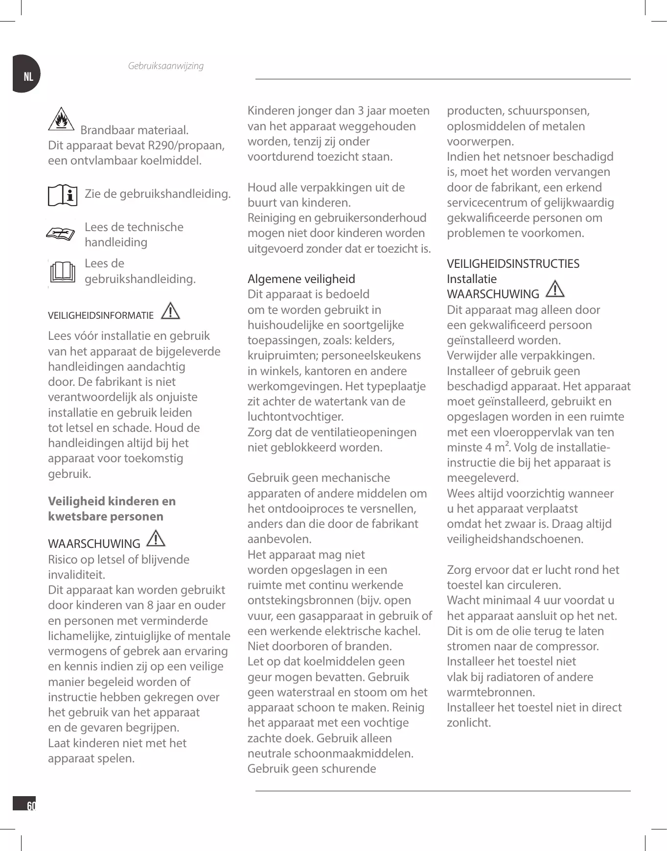VEILIGHEIDSINFORMATIE Lees vóór installatie en gebruik van het apparaat de bijgeleverde handleidingen aandachtig door. De fabrikant is niet verantwoordelijk als onjuiste installatie en gebruik leiden tot letsel en schade. Houd de handleidingen altijd bij het apparaat voor toekomstig gebruik. Veiligheid kinderen en kwetsbare personen WAARSCHUWING Risico op letsel of blijvende invaliditeit. 3. Sluit de luchtontvochtiger aan op de voeding. Zonder slang, direct op een afvoer: 1. Haal de stekker uit het stopcontact en verwijder het waterreservoir. 2. Plaats de luchtontvochtiger direct boven de afvoer zodat het onttrokken water door het gat in de onderkant van de luchtontvochtiger in de afvoer kan