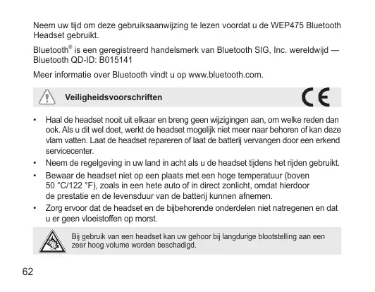 Neem uw tijd om deze gebruiksaanwijzing te lezen voordat u de WEP475 Bluetooth Headset gebruikt. Bluetooth® is een geregistreerd handelsmerk van Bluetooth SIG, Inc. wereldwijd — Bluetooth QD-ID: B015141 Meer informatie over Bluetooth vindt u op www.bluetooth.com. Veiligheidsvoorschriften •