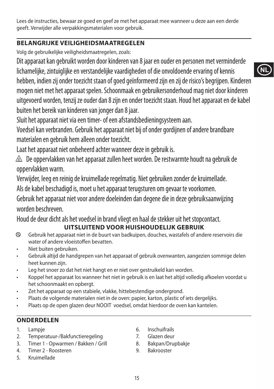 Dit apparaat kan gebruikt worden door kinderen van 8 jaar en ouder en personen met verminderde lichamelijke, zintuiglijke en verstandelijke vaardigheden of die onvoldoende ervaring of kennis hebben, indien zij onder toezicht staan of goed geïnformeerd zijn en zij de risico’s begrijpen. Kinderen mogen niet met het apparaat spelen. Schoonmaak en gebruikersonderhoud mag niet door kinderen uitgevoerd worden, tenzij ze ouder dan 8 zijn en onder toezicht staan. Houd het apparaat en de kabel buiten het bereik van kinderen van jonger dan 8 jaar. Sluit het apparaat niet via een timer- of een afstandsbedieningsysteem aan. Voedsel kan verbranden. Gebruik het apparaat niet bij of onder gordijnen of andere brandbare materialen en gebruik hem alleen onder toezicht. Laat het apparaat niet onbeheerd achter wanneer deze in gebruik is. h De oppervlakken van het apparaat zullen heet worden. De restwarmte houdt na gebruik de oppervlakken warm. Verwijder, leeg en reinig de kruimellade regelmatig. Niet gebruiken zonder de kruimellade. Als de kabel beschadigd is, moet u het apparaat terugsturen om gevaar te voorkomen. Gebruik het apparaat niet voor andere doeleinden dan degene die in deze gebruiksaanwijzing worden beschreven. Houd de deur dicht als het voedsel in brand vliegt en haal de stekker uit het stopcontact. UITSLUITEND VOOR HUISHOUDELIJK GEBRUIK